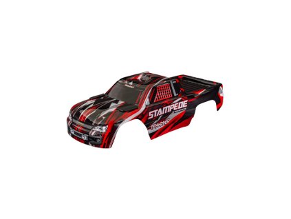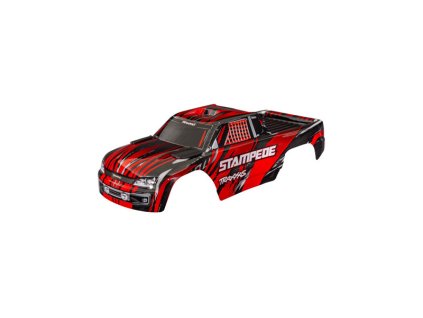 Traxxas karosérie Stampede červená (bezsponková), hotová nabarvená, aplikované obtisky. Vhodná i pro Stampede VXL. Včetně předního a zadního bezsponkového držáku karoserie.