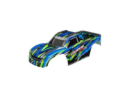 Traxxas karosérie Stampede zelená (bezsponková), hotová nabarvená, aplikované obtisky. Vhodná i pro Stampede VXL. Včetně předního a zadního bezsponkového držáku karoserie.