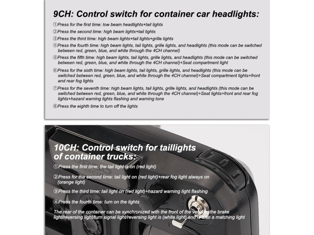 - Zvuky: signál zpátečky, zvuk zatáčení, klakson, zvuk výstražných světel - ovládání kanálem CH6