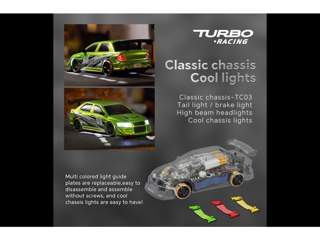 Představujeme první plně proporcionální dálkově ovládané auto velikosti prstu na světě - RC auto 1:76 Turbo Racing. Poprvé v hobby průmyslu s rádiovým ovládáním lze RC vůz takové velikosti ovládat s takovou přesností a jemností. Díky zcela novému patentovanému systému řízení potenciometrem, který je nejmenší svého druhu, můžete ovládat vozidlo přesně tak, jak chcete.