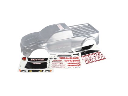Nenabarvená lexanová karosérie Traxxas T-Maxx 3.3 (s delším rozvorem). Obsahem balení je dále arch samolepek.