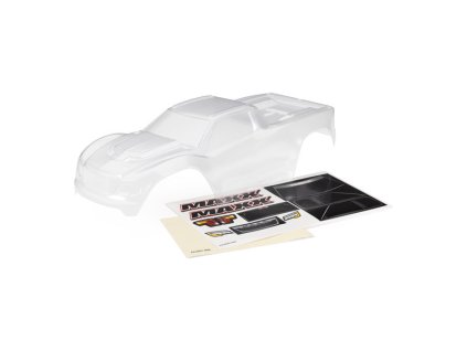 Nenabarvená lexanová karosérie pro RC model auta Traxxas E-Maxx na střídavý motor (Brushless) . Součástí je arch samolepek.