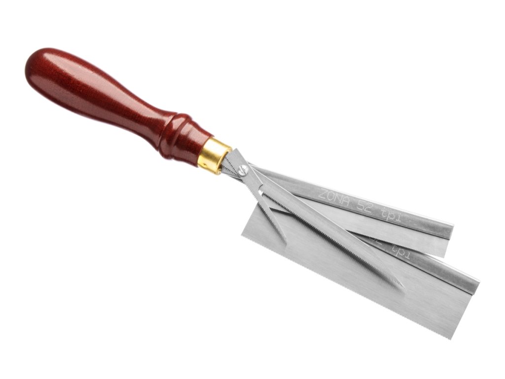 Sada obsahující tlustší hruškovitou dřevěnou rukojeť a čtyři výměnné pilové listy ZONA: 36-050 ultratenká 52zubů/palec 114x11,1mm, 36-555 tenká široká 39,7x30,1mm, 32zubů/palec, 36-458 dlouhá děrovka 114mm, 24zubů/palec a 36-408 tenká děrovka o délce 57mm, 24zubů/palec. Náhradní listy se prodávají zvlášť.Doplňkové parametry