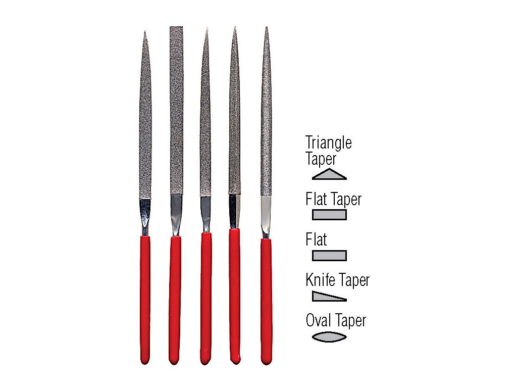 Sada 5 diamantových jehlových pilníků ZONA - trojúhelníkový-nízký tupoúhlý, čtyřhranný-plochý, čtyřhranný-plochý s ostrou špičkou, nožovitý, oválný. Pro přesné opracování skla, kovů, keramiky, mramoru, dřeva, plastů, kamene, kostí atd.Doplňkové parametry