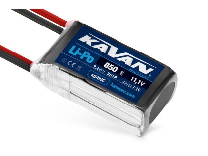 LiPo akumulátorová sadaKAVAN se zvýšenou zatížitelností 40/80C, nabíjení až 2C. Tříčlánek 3s1p 11,1 V 850 mAh, rozměry: 60x30x20,5mm, hmotnost: 67g, servisní konektor JST-XH.