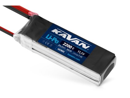 LiPo akumulátorová sada KAVAN se zvýšenou zatížitelností 40/80C, nabíjení až 2C. Tříčlánek 3s1p 11,1V 2200 mAh, rozměry: 110x35x22,5mm, hmotnost: 166g, servisní konektor JST-XH.