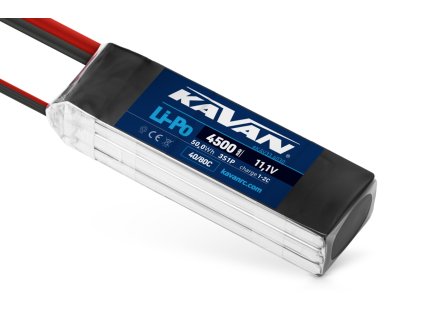 LiPo akumulátorová sada KAVAN se zvýšenou zatížitelností 40/80C, nabíjení až 2C. Tříčlánek 3s1p 11,1V 4500 mAh, rozměry: 139x42,5x26mm, hmotnost: 315g, servisní konektor JST-XH.