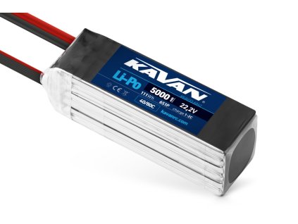 LiPo akumulátorová sada KAVAN se zvýšenou zatížitelností 40/80C, nabíjení až 2C. Šestičlánek 6s1p 22,2V 5000 mAh, rozměry: 139x43x53mm, hmotnost: 655g, servisní konektor JST-XH.