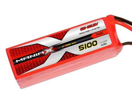 LiPo akumulátorová sada ManiaX se zatížitelností 70/140C, nabíjení 1-3C, max. 5C. Šestičlánek 6S 22,2V 5100 mAh, rozměry: 158x48x47, hmotnost: 780g, servisní konektor JST-XH.