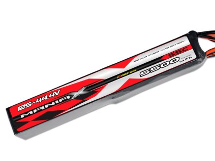 LiPo akumulátorová sada ManiaX se zatížitelností 80/160C, nabíjení 1-3C, max. 5C. Dvanáctičlánek 12S 44,4V 5200 mAh, rozměry: 310x48x50, hmotnost: 1625g, servisní konektor JST-XH.