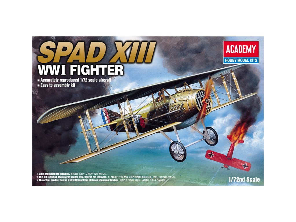 Plastikový model Academy 12446 - letadlo SPAD XIII v měřítku 1:72 ke slepení. Rozpětí 110 mm.