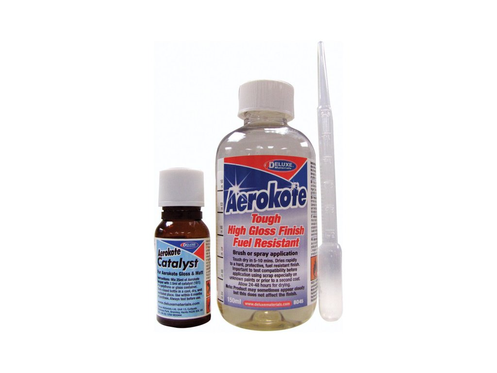 Aerokote je velmi kvalitní lesklý dvousložkový lak na nejrůznější povrchy. Je odolný vůči benzinu, palivu do žhavicích motorů, lihu, kerosinu, syntetickým olejům. Nanáší se štětcem nebo stříkací pistolí. Ideální pro finální vrstvu RC letadel.