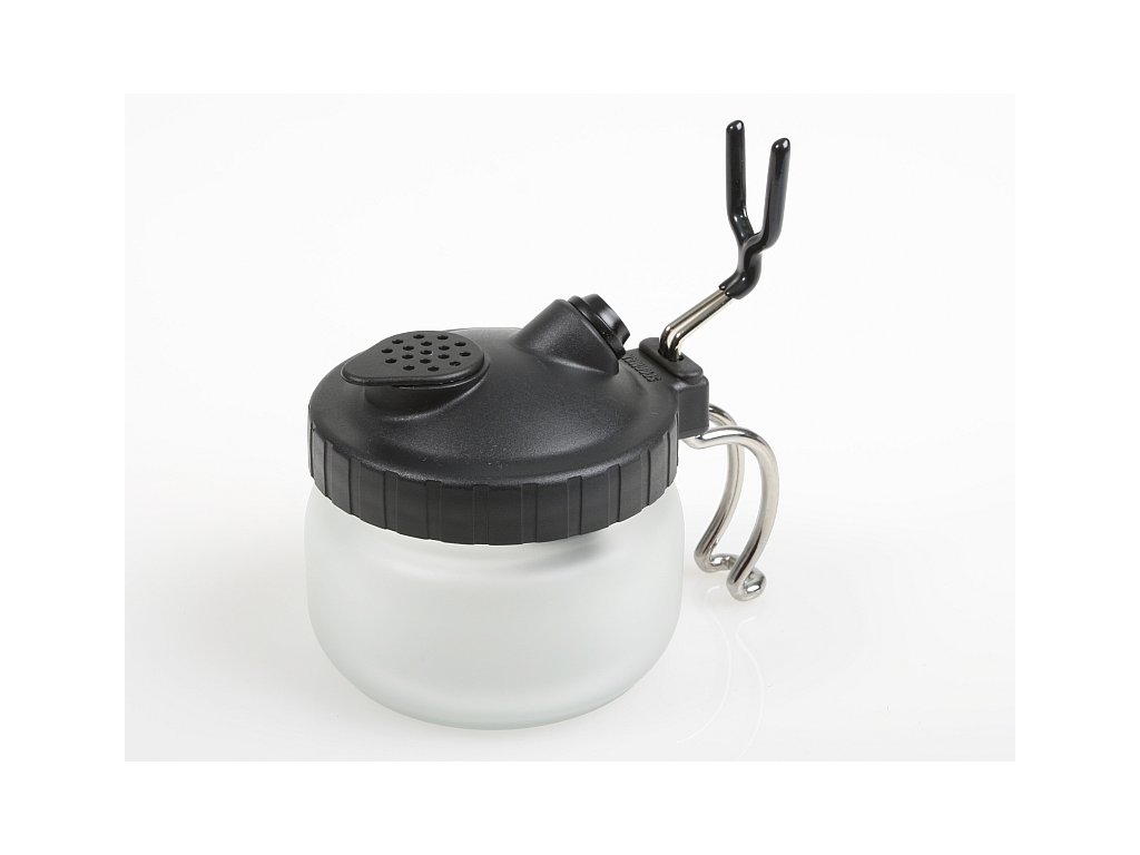 Uzavřený box s jemným výstupním filtrem pro čištění airbrushí.