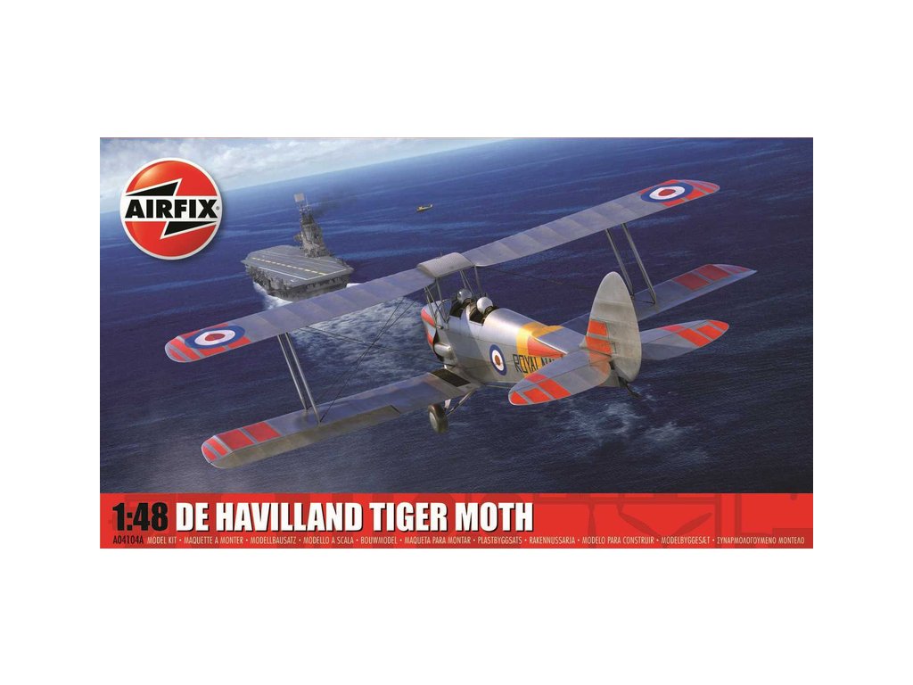 Airfix plastikový model letadla de Havilland Tiger Moth v měřítku 1:48 ke slepení. Stavebnice obsahuje 91 dílků, rozpětí křídel 217 mm, obtížnost 3.