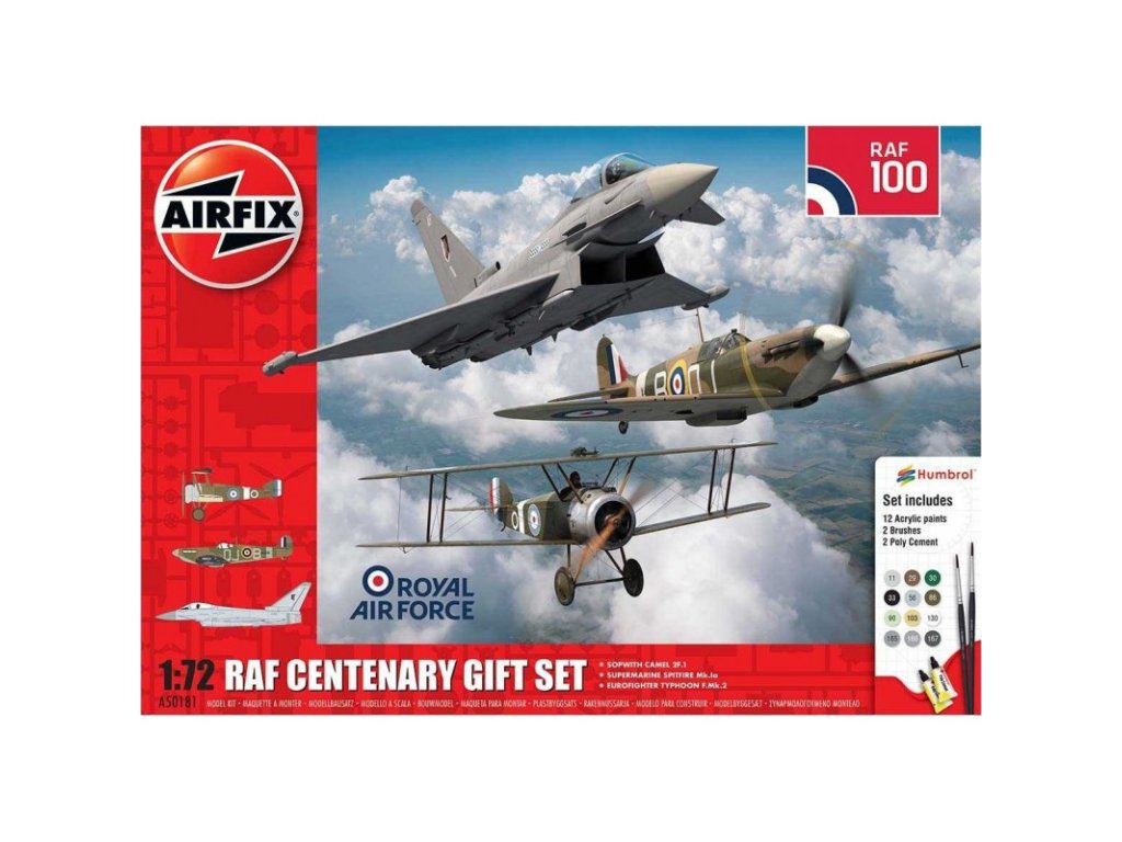 Dárková sada plastikových modelů Airfix A50181 - Giftset ke 100. výročí RAF v měřítku 1:72 ke slepení. Balení obsahuje 26+36+65 dílů ke slepení. Rozpětí křídel: 118 mm, 156 mm, 152 mm.