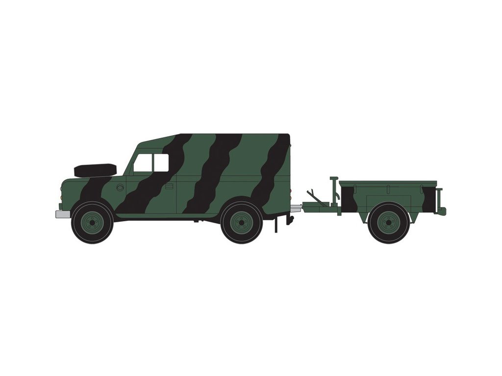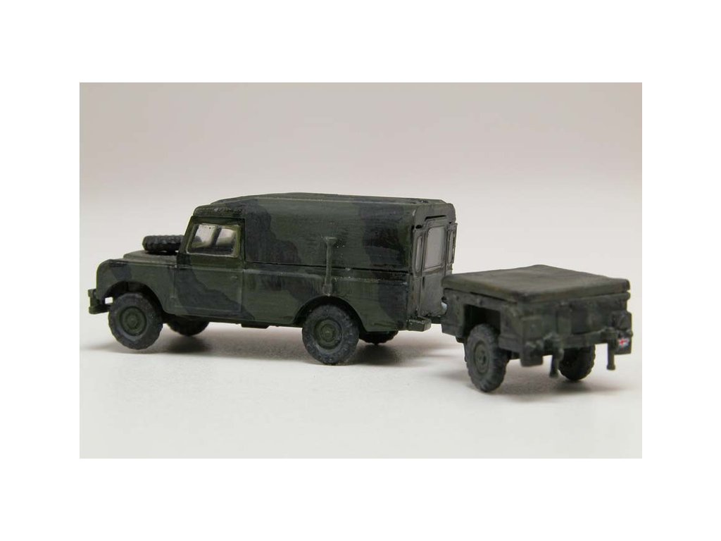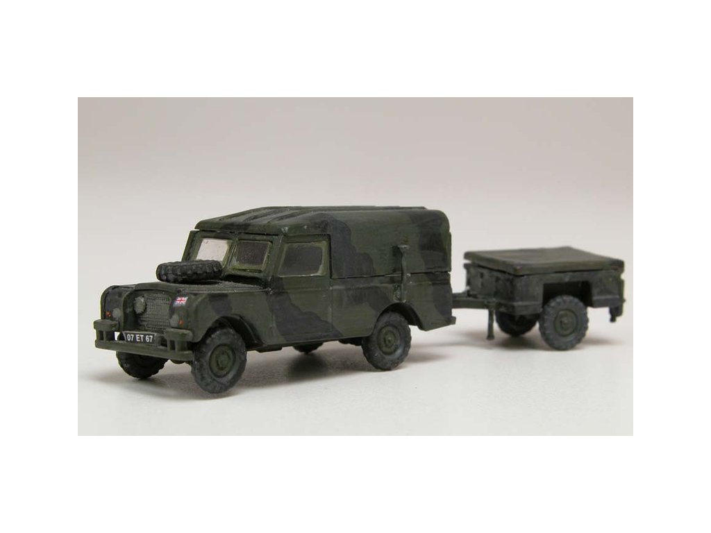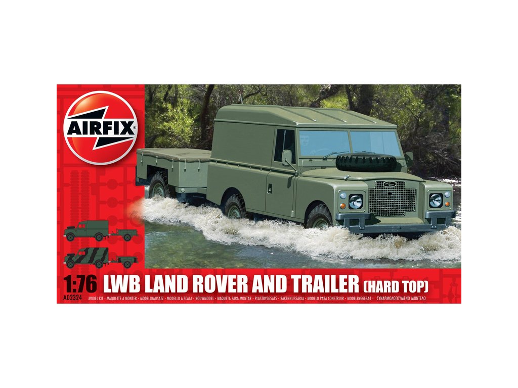 Plastikový model Airfix A02324 - military LWB Land Rover (Hard Top) and Trailer v měřítku 1:76 ke slepení. Stavebnice obsahuje 45 dílků, obtížnost 1.