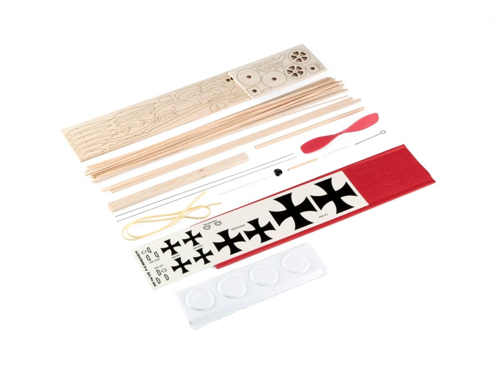 Stavebnice obsahuje: balsové laserem vyřezávané díly, balsové nosníky, vakuově lisované díly (kryt motoru, kryt kabiny...), plastovou vrtuli s hřídelí a hlavicí, gumový svazek (soutěžní guma FAI TAN II), kola, ocelovou strunu na podvozek a další drobné díly, barevný potahový papír, aršík samolepek, stavební plán.
