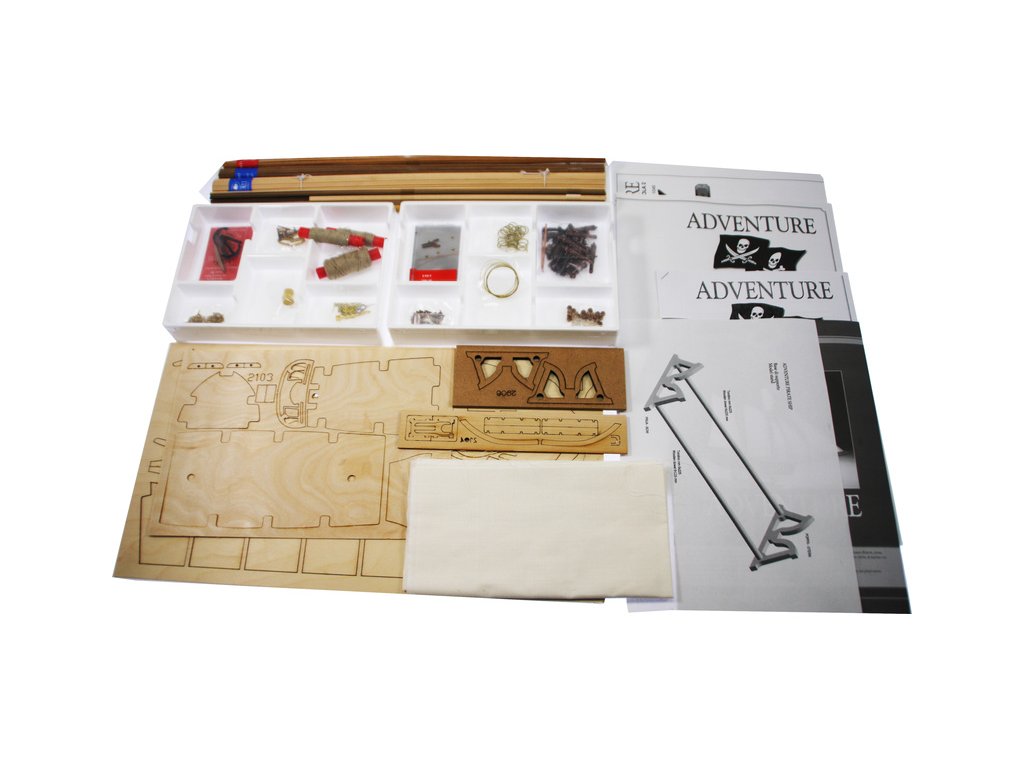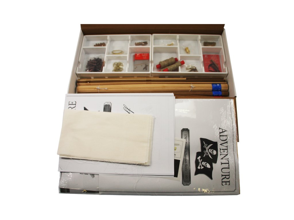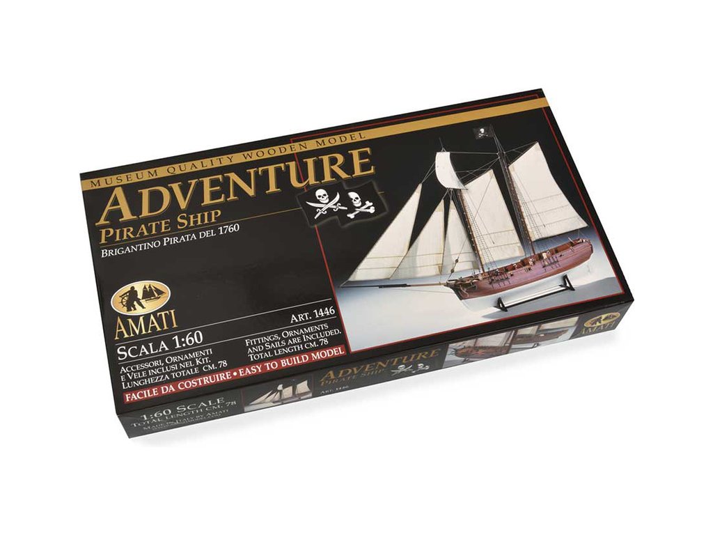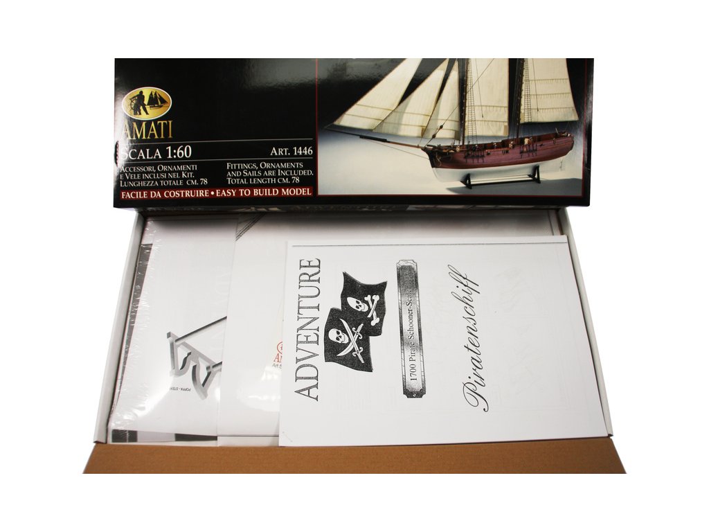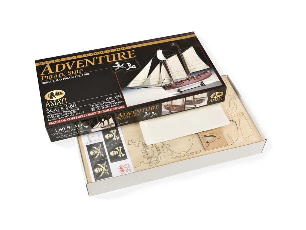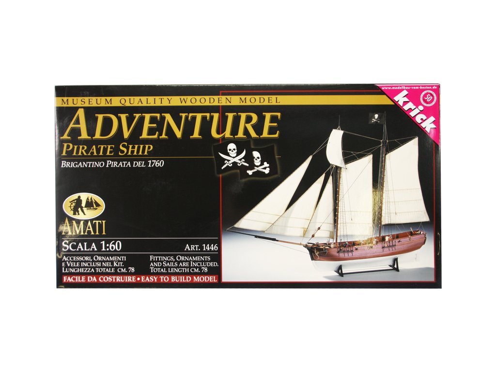 Stavebnice statické makety historické lodi AMATI Adventure pirátská loď z roku 1760 v měřítku 1:60, kit. Pirátská loď známých pirátů Edwarda Anglického z afrických vod a John Calico Rackam, který děsil Indii s pirátskou nevěstou Annou Bonny Westovou. Dřevěné díly, kýl a obšívka jsou řezány laserem, obsaženy jsou plachty, lanoví, stožáry, kování, doplňky, podrobný obrázkový návod ke stavbě s německým popisem a plány.