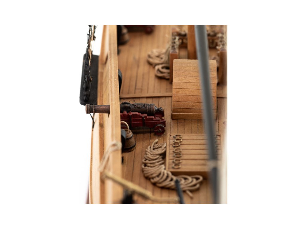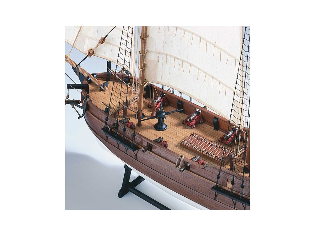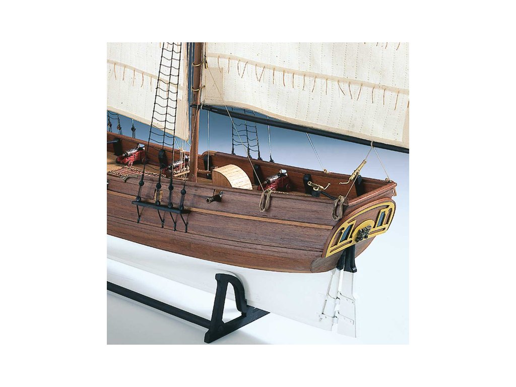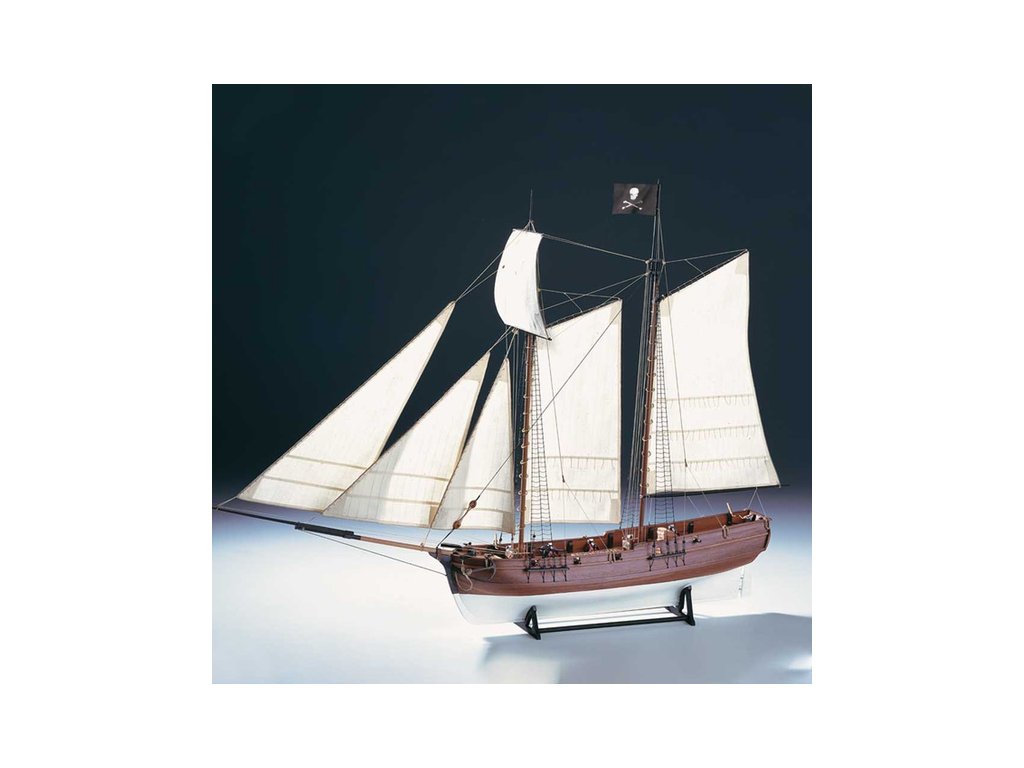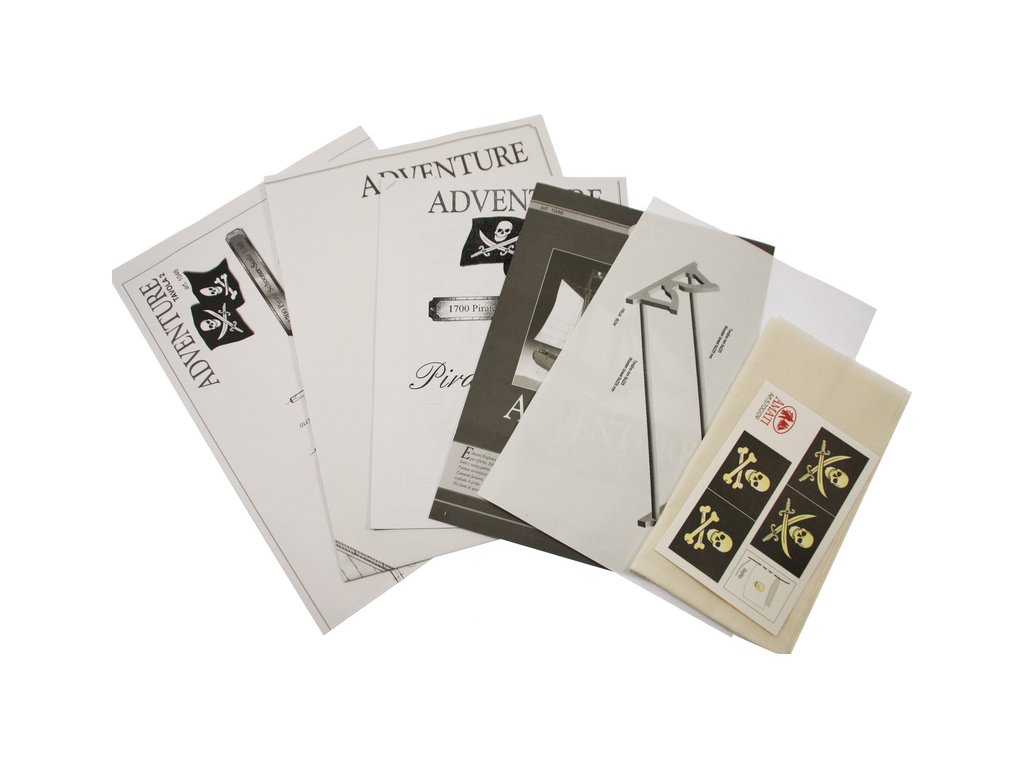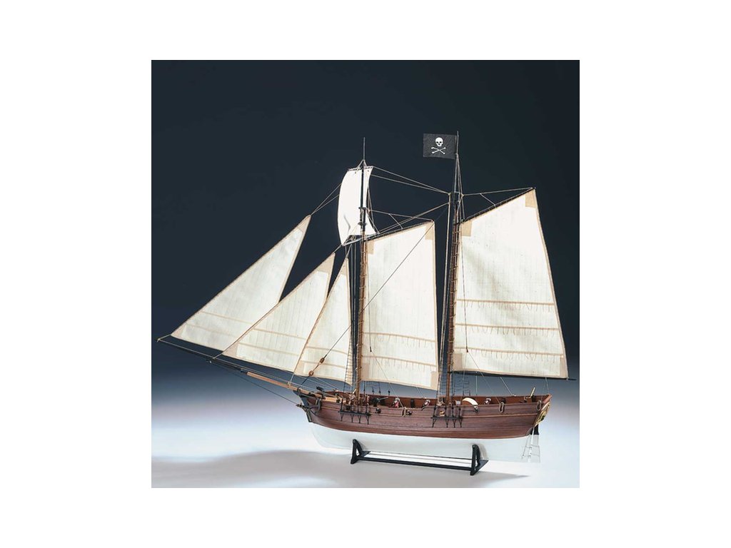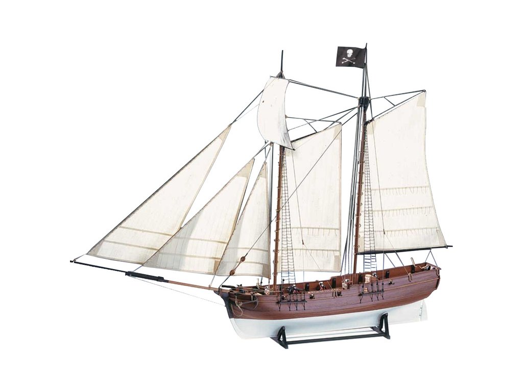 Stavebnice statické makety historické lodi AMATI Adventure pirátská loď z roku 1760 v měřítku 1:60, kit. Pirátská loď známých pirátů Edwarda Anglického z afrických vod a John Calico Rackam, který děsil Indii s pirátskou nevěstou Annou Bonny Westovou. Dřevěné díly, kýl a obšívka jsou řezány laserem, obsaženy jsou plachty, lanoví, stožáry, kování, doplňky, podrobný obrázkový návod ke stavbě s německým popisem a plány.