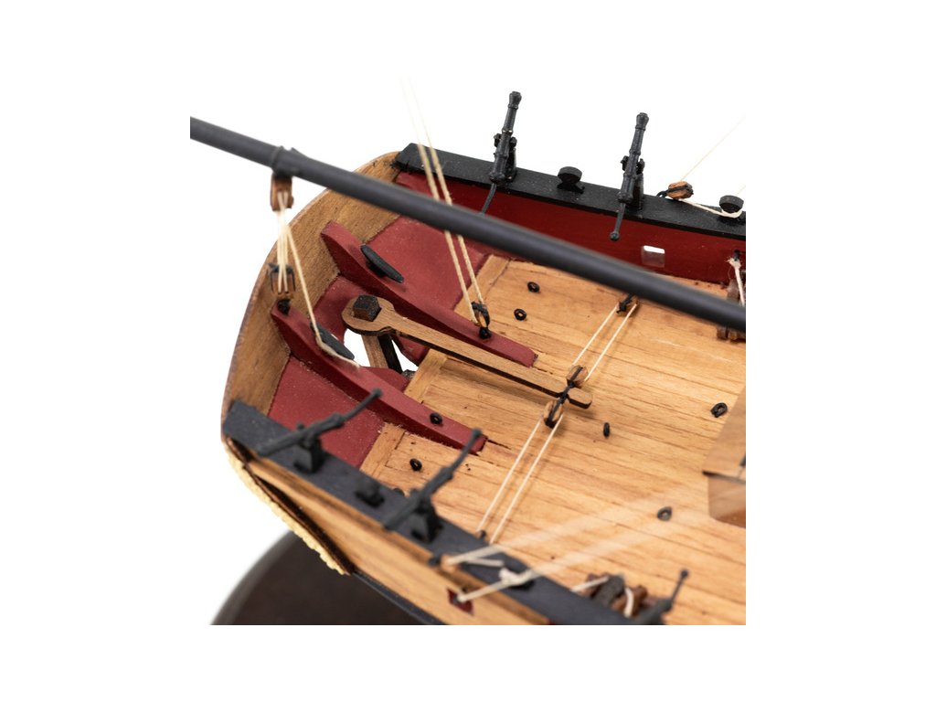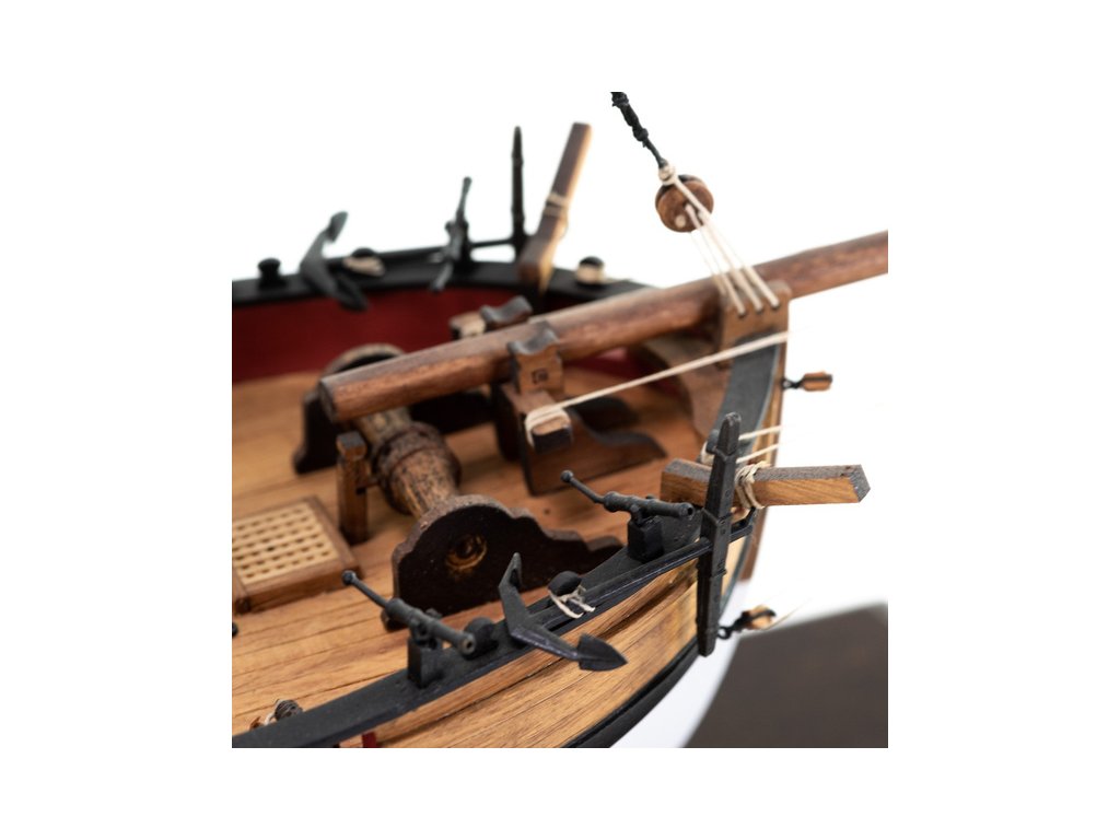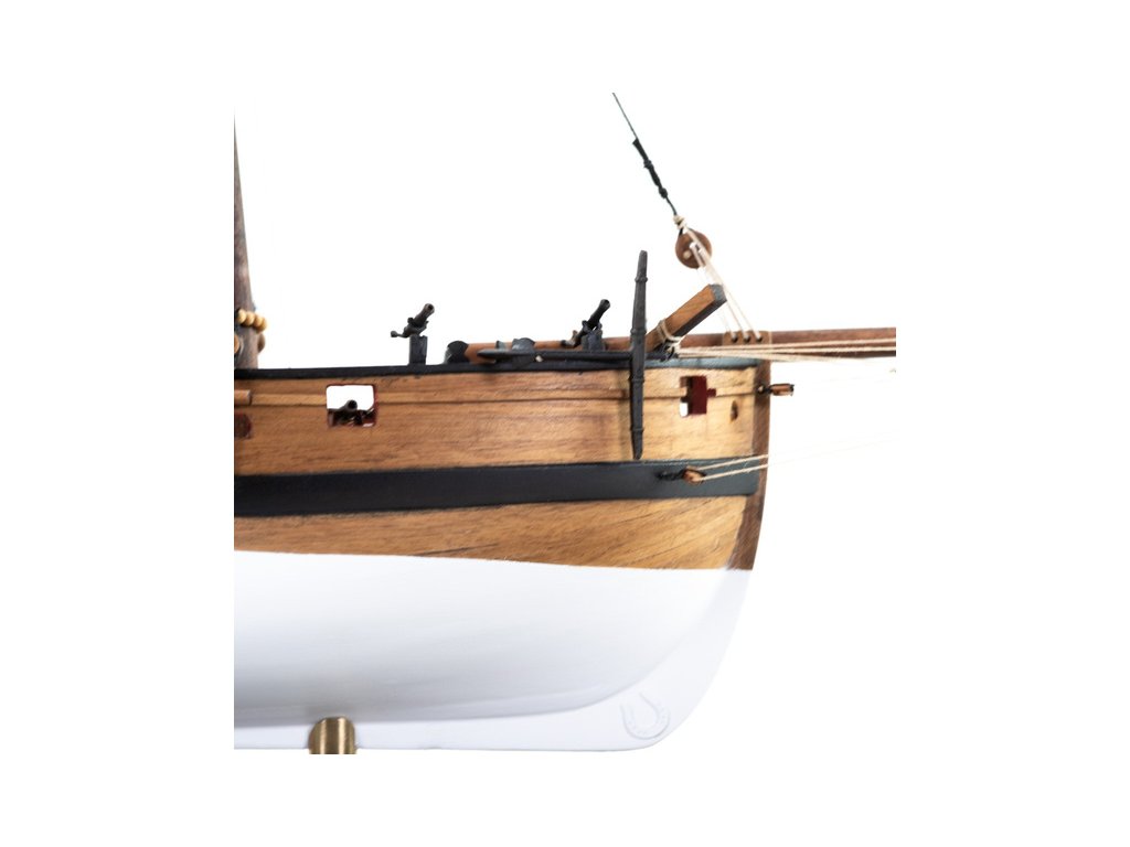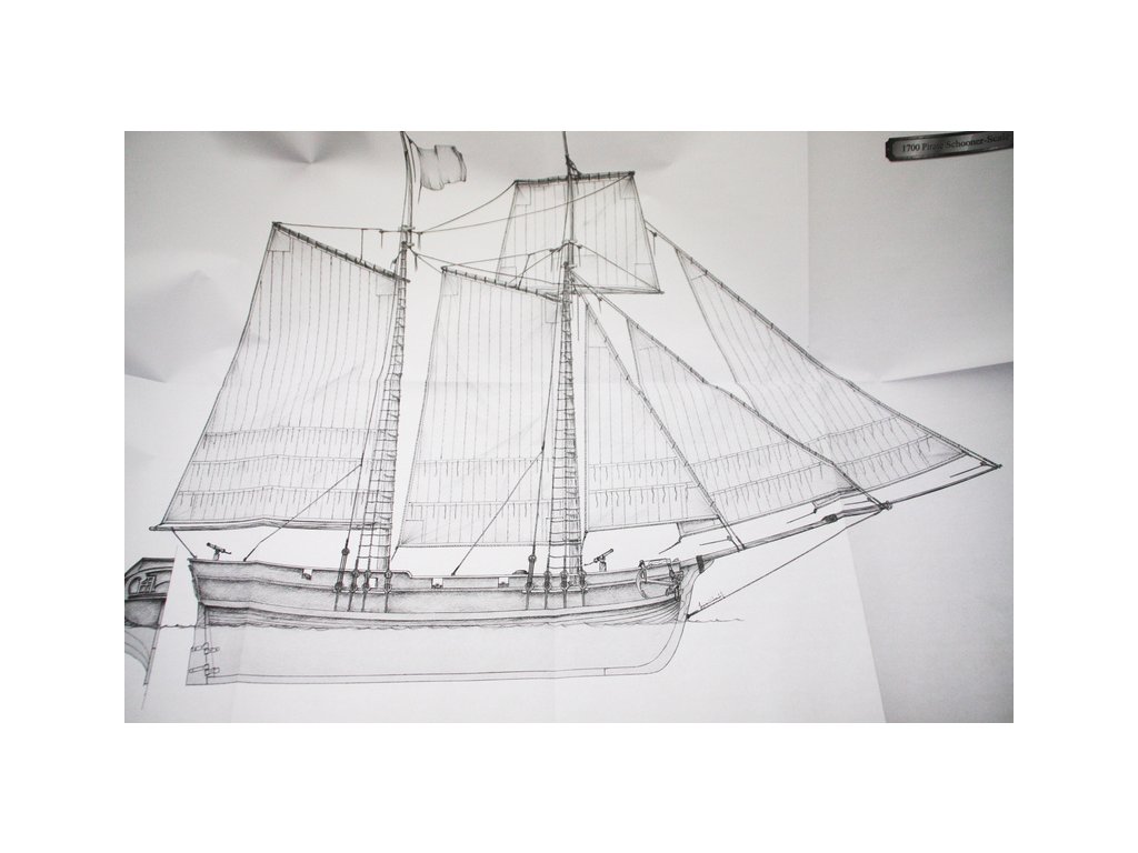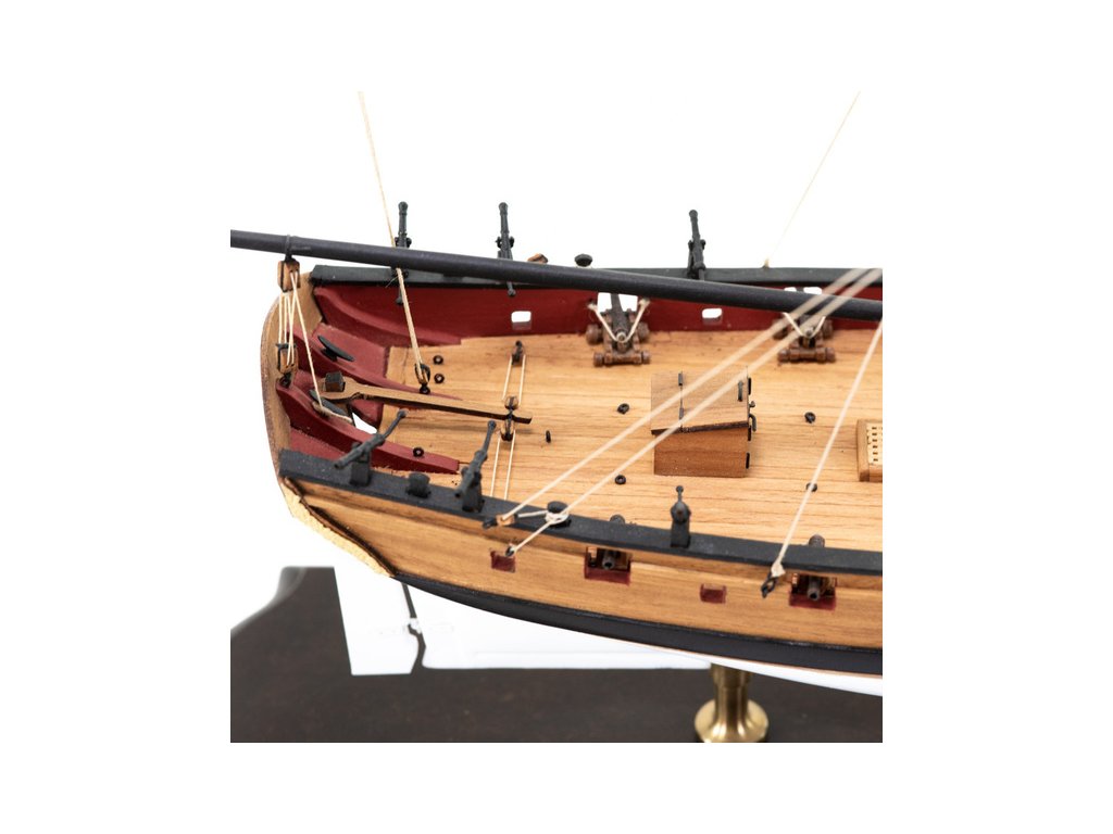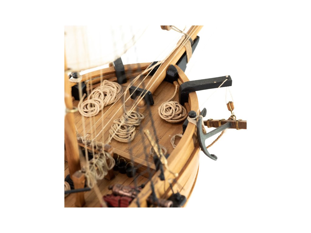 Stavebnice statické makety historické lodi AMATI Adventure pirátská loď z roku 1760 v měřítku 1:60, kit. Pirátská loď známých pirátů Edwarda Anglického z afrických vod a John Calico Rackam, který děsil Indii s pirátskou nevěstou Annou Bonny Westovou. Dřevěné díly, kýl a obšívka jsou řezány laserem, obsaženy jsou plachty, lanoví, stožáry, kování, doplňky, podrobný obrázkový návod ke stavbě s německým popisem a plány.