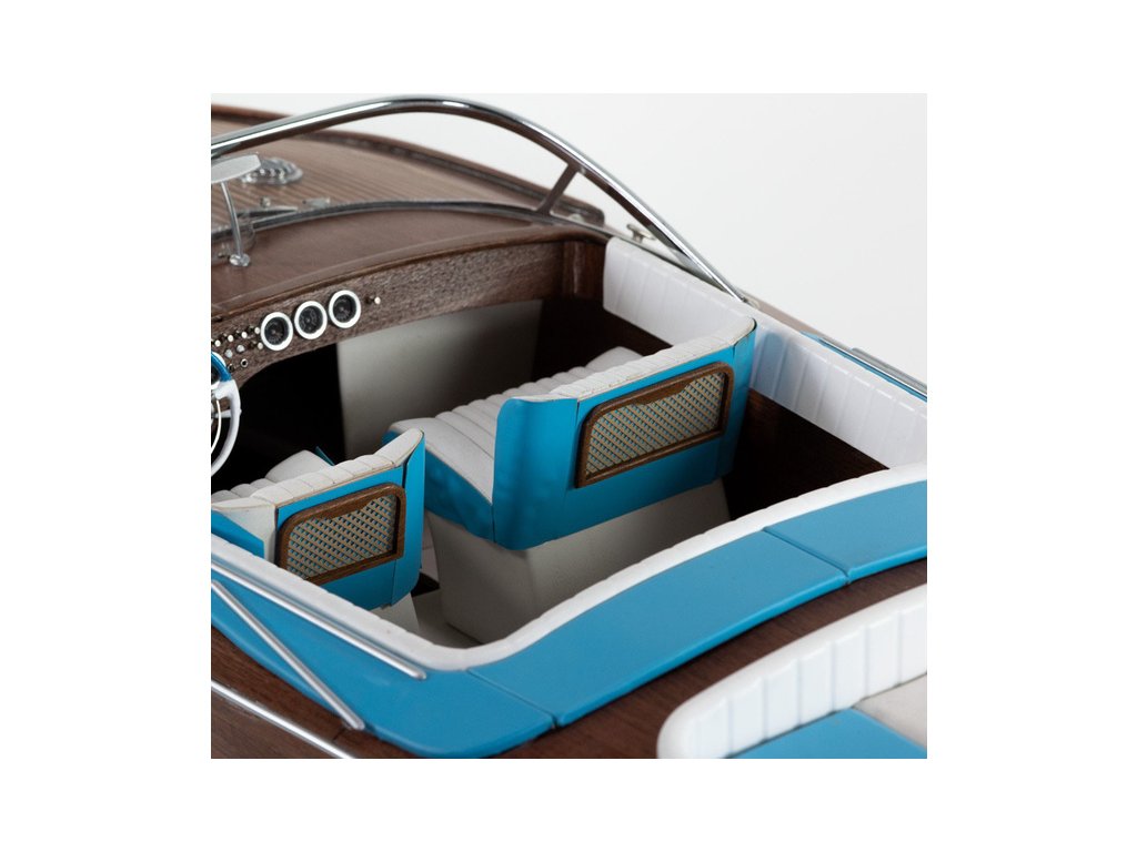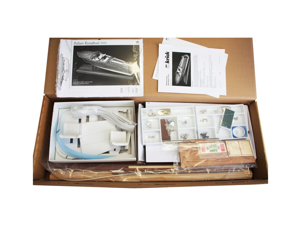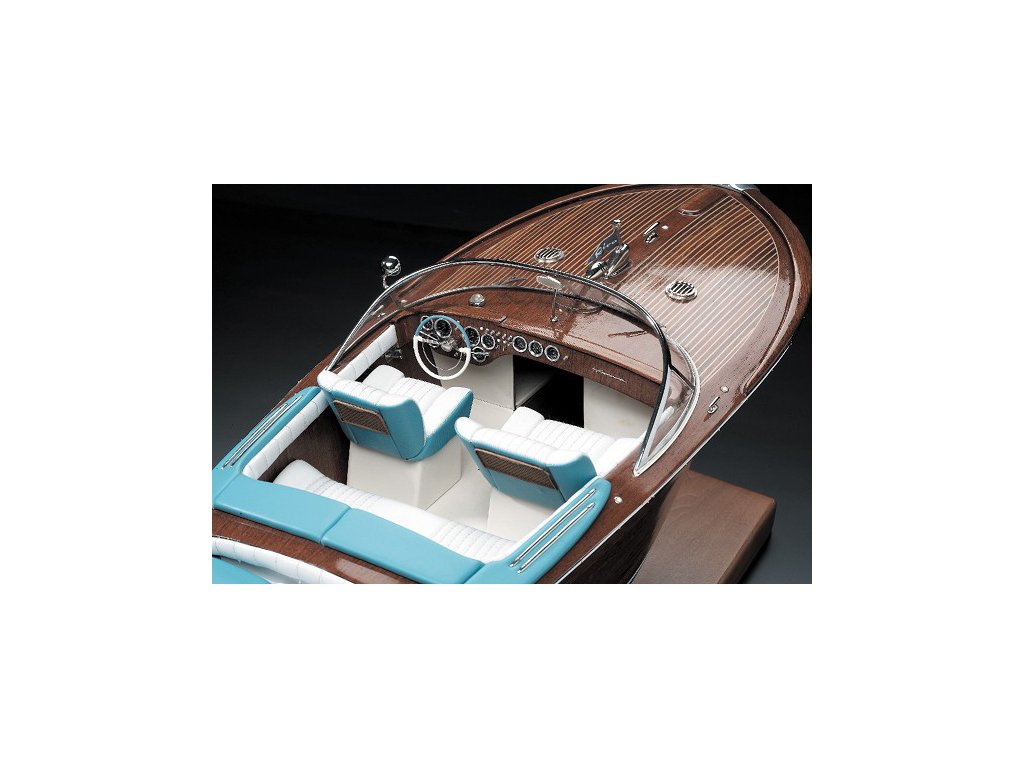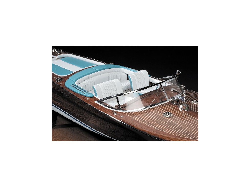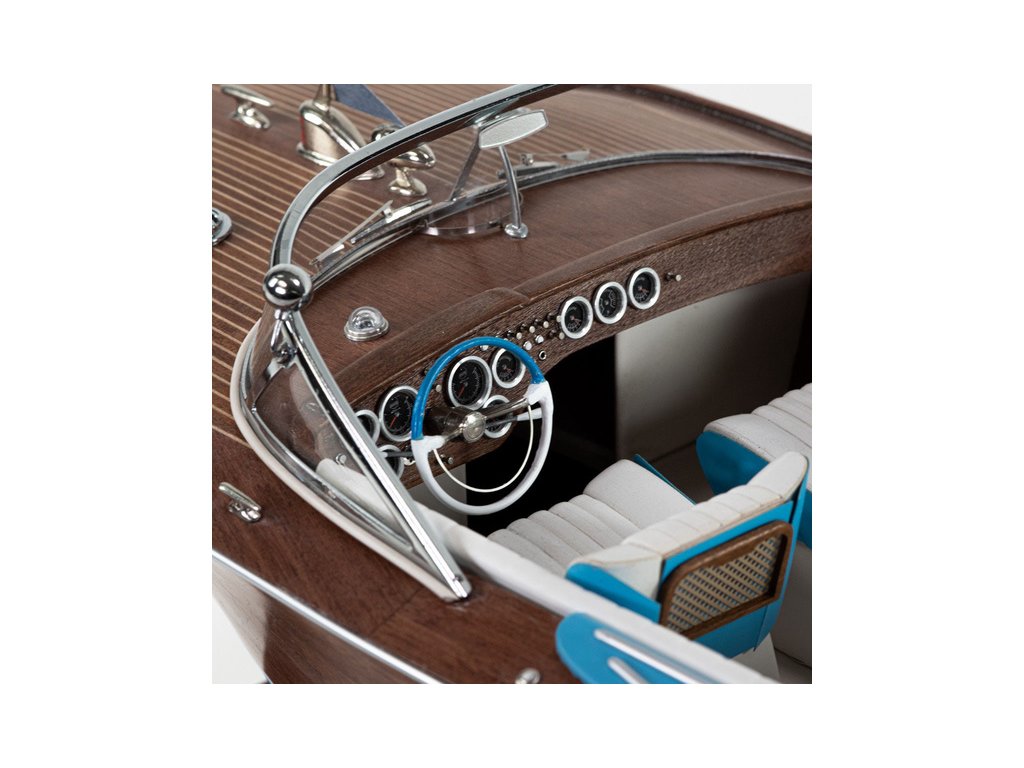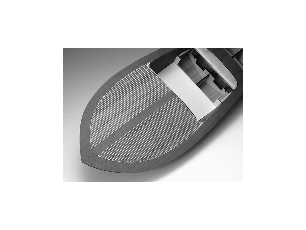 Stavebnice lodi, AMATI Aquarama italský sportovní člun v měřítku 1:10, kit. Model lze použít jako statickou maketu nebo jej vyrobit jako funkční a vybavit jej pohonem a dálkovým ovládáním. Jde o celodřevěný model vyrobený klasicky z laserem řezaných dílů, slepen, lakován. Sedačky a čalounění jsou hotové.