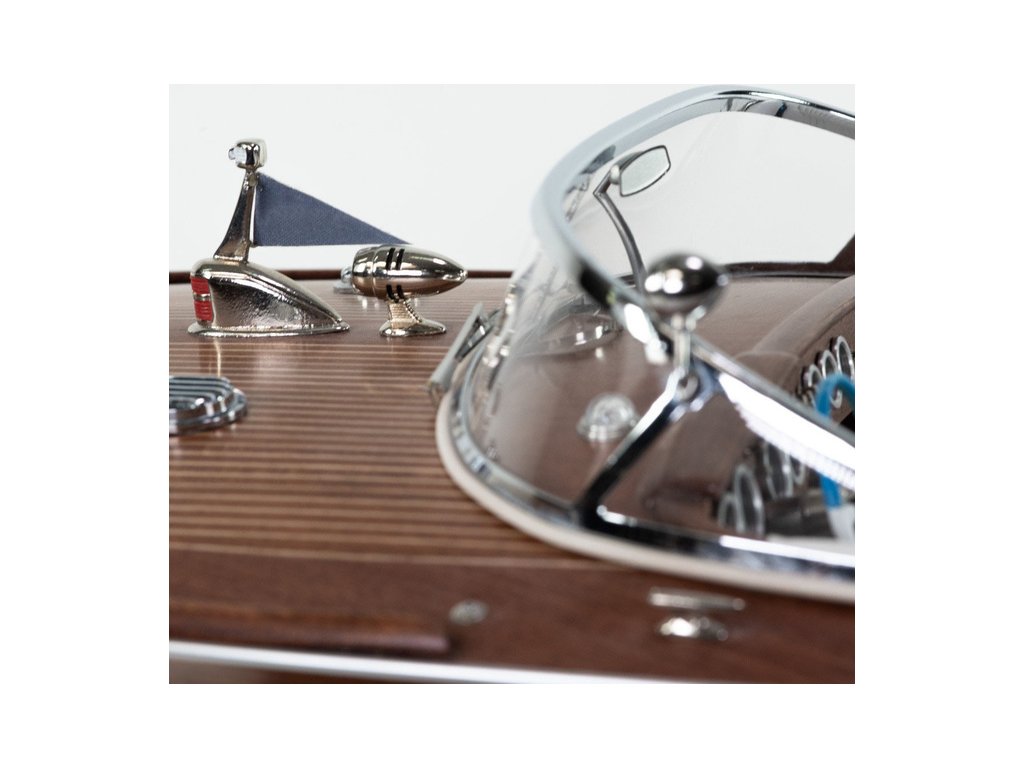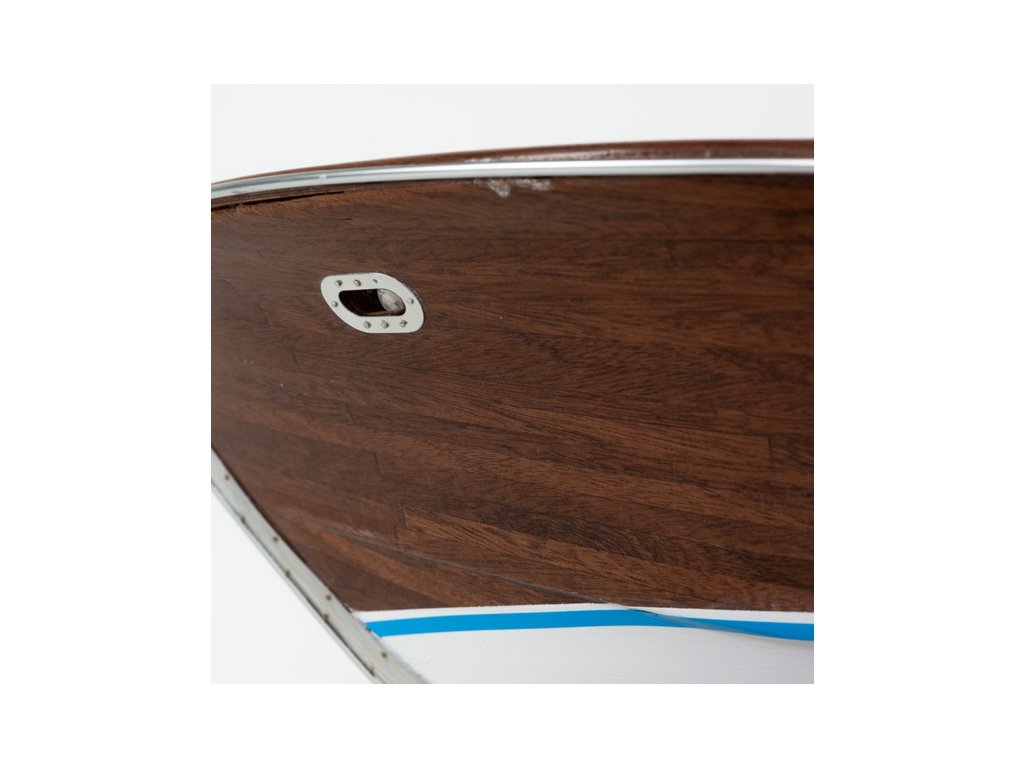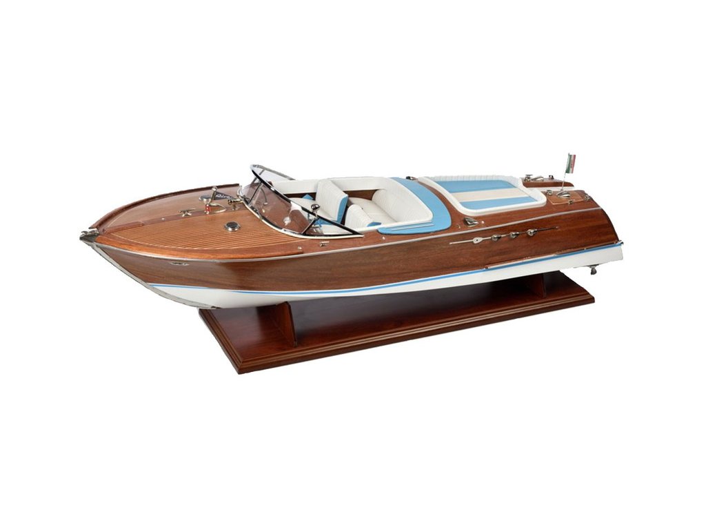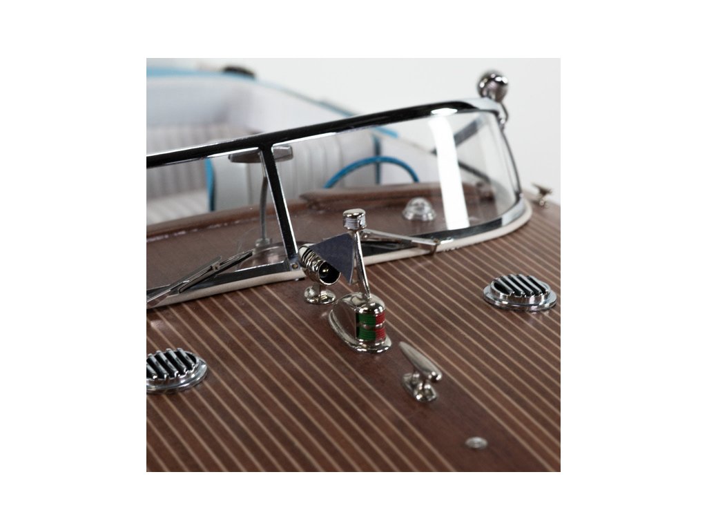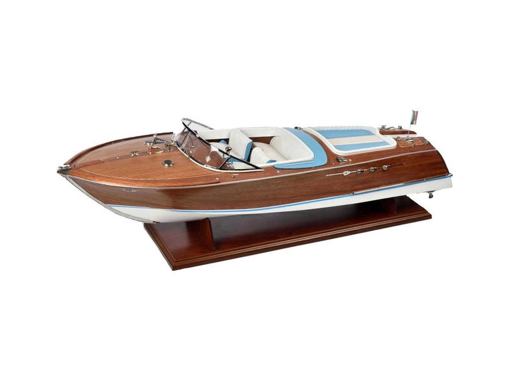 Stavebnice lodi, AMATI Aquarama italský sportovní člun v měřítku 1:10, kit. Model lze použít jako statickou maketu nebo jej vyrobit jako funkční a vybavit jej pohonem a dálkovým ovládáním. Jde o celodřevěný model vyrobený klasicky z laserem řezaných dílů, slepen, lakován. Sedačky a čalounění jsou hotové.
