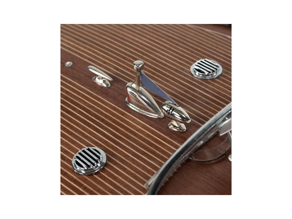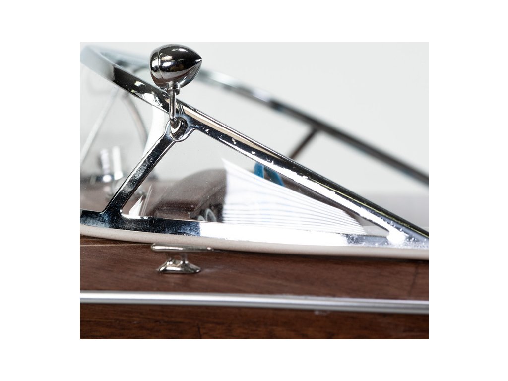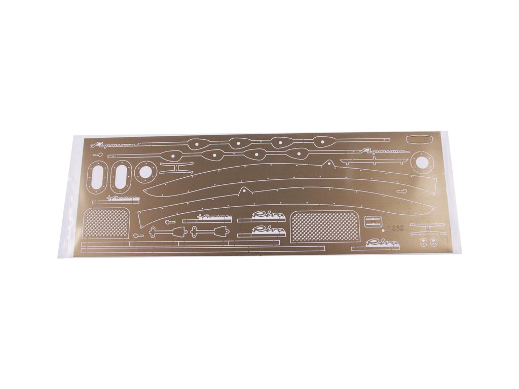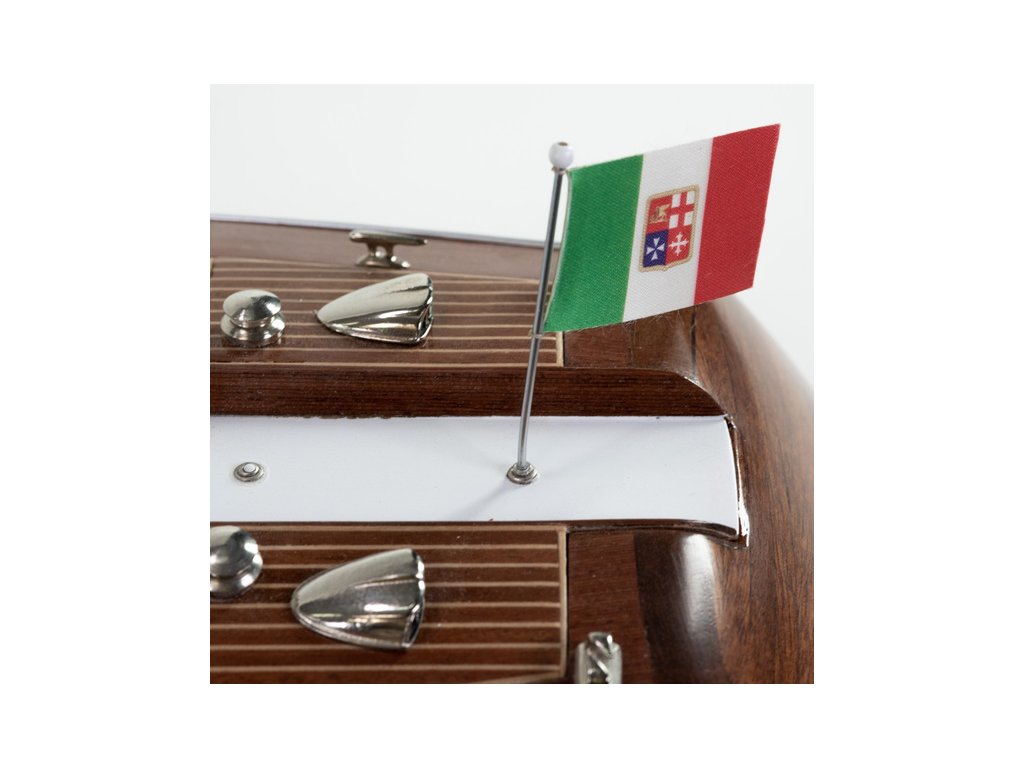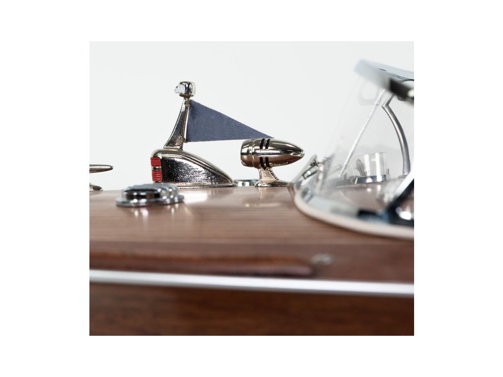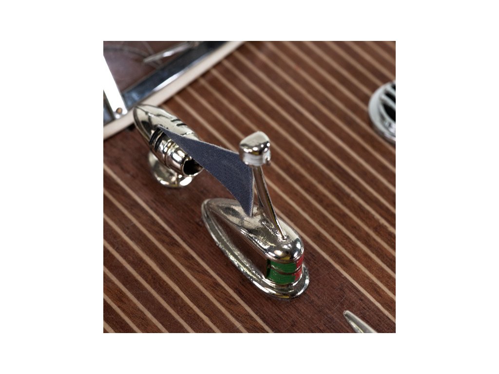 Stavebnice lodi, AMATI Aquarama italský sportovní člun v měřítku 1:10, kit. Model lze použít jako statickou maketu nebo jej vyrobit jako funkční a vybavit jej pohonem a dálkovým ovládáním. Jde o celodřevěný model vyrobený klasicky z laserem řezaných dílů, slepen, lakován. Sedačky a čalounění jsou hotové.