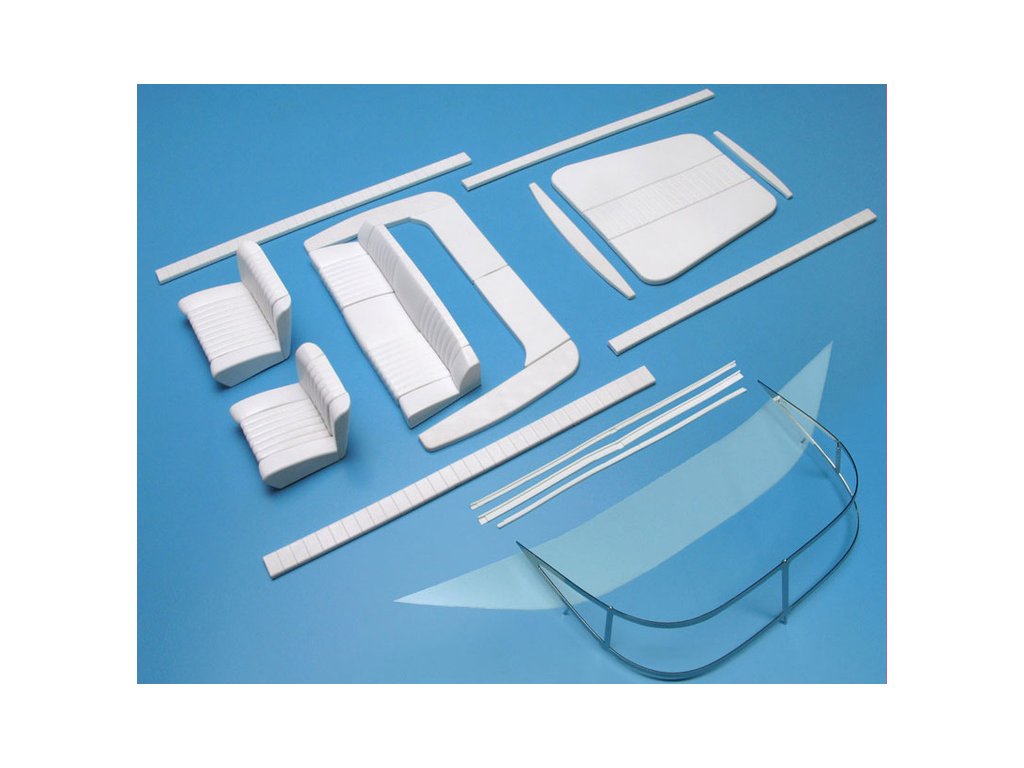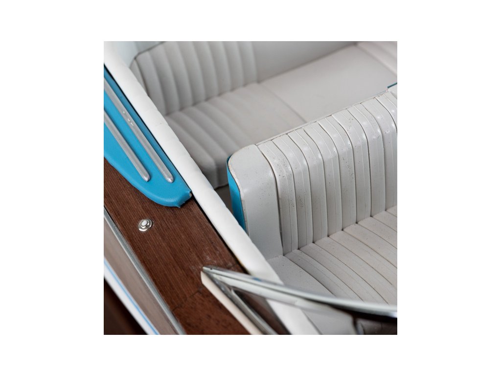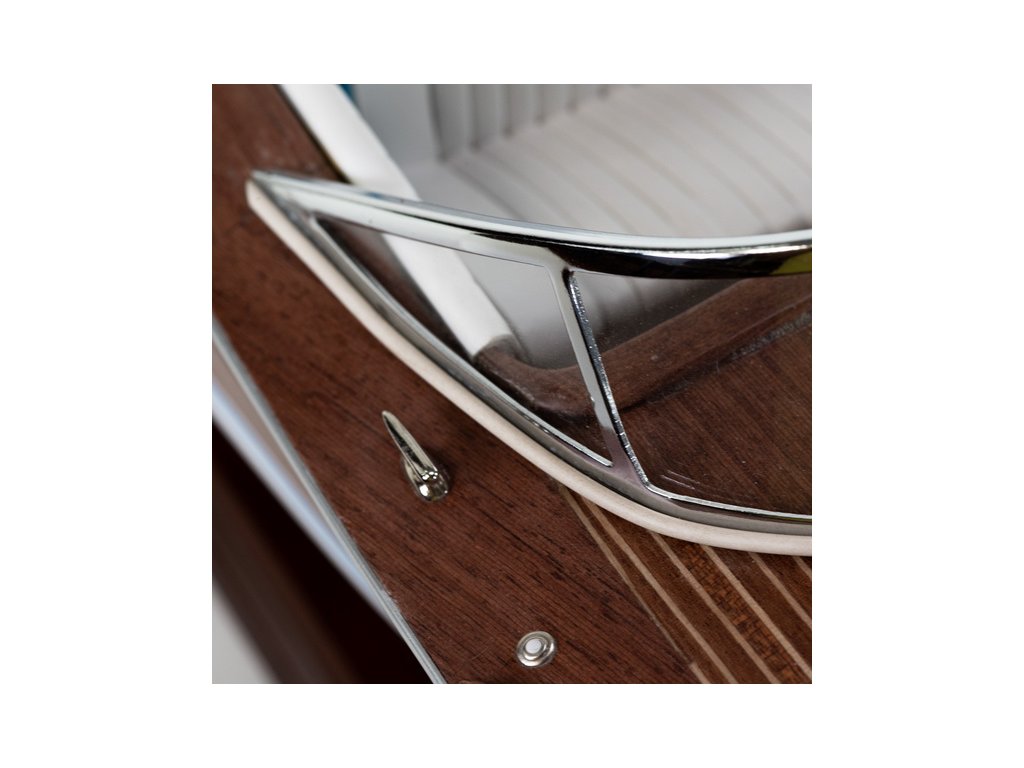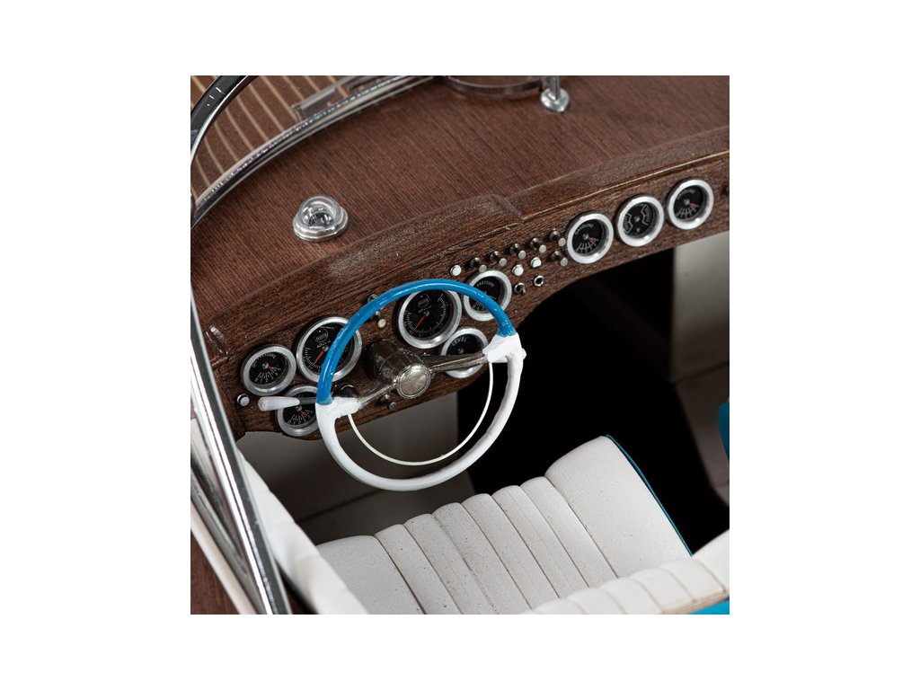 Stavebnice lodi, AMATI Aquarama italský sportovní člun v měřítku 1:10, kit. Model lze použít jako statickou maketu nebo jej vyrobit jako funkční a vybavit jej pohonem a dálkovým ovládáním. Jde o celodřevěný model vyrobený klasicky z laserem řezaných dílů, slepen, lakován. Sedačky a čalounění jsou již hotovy.