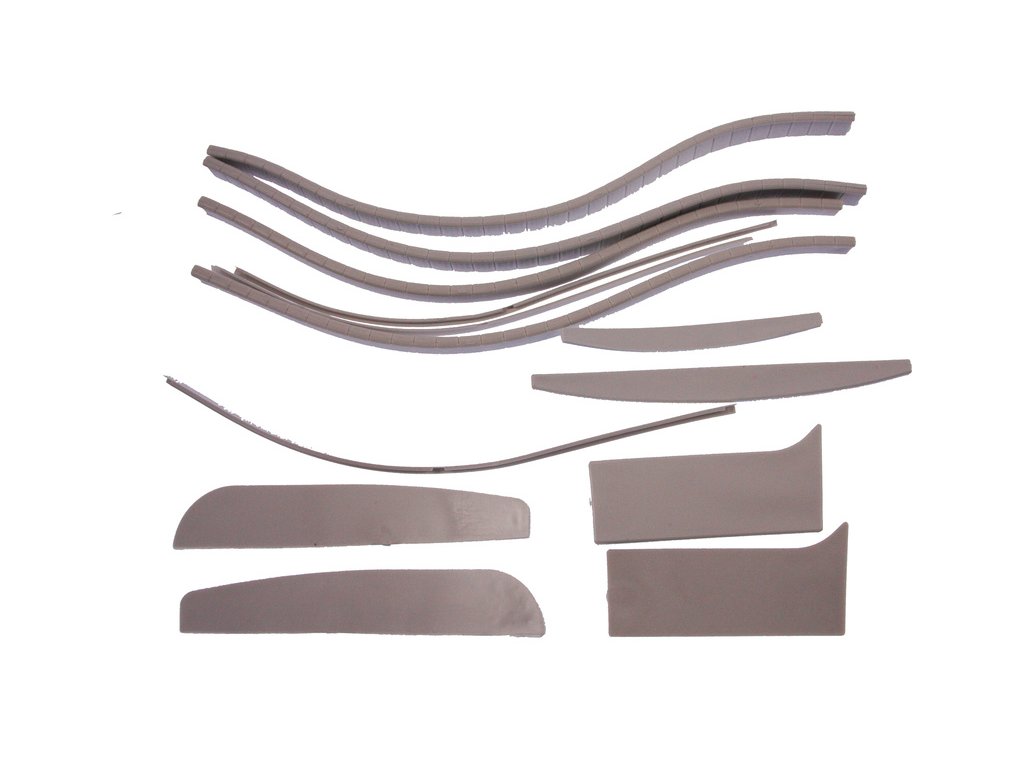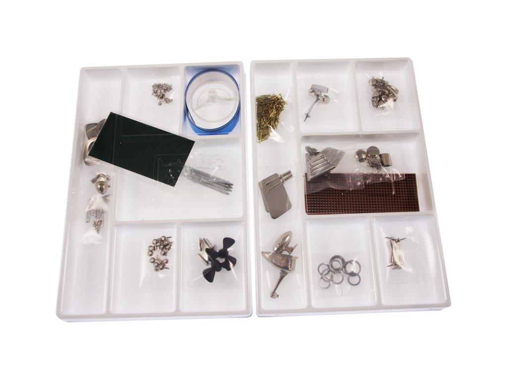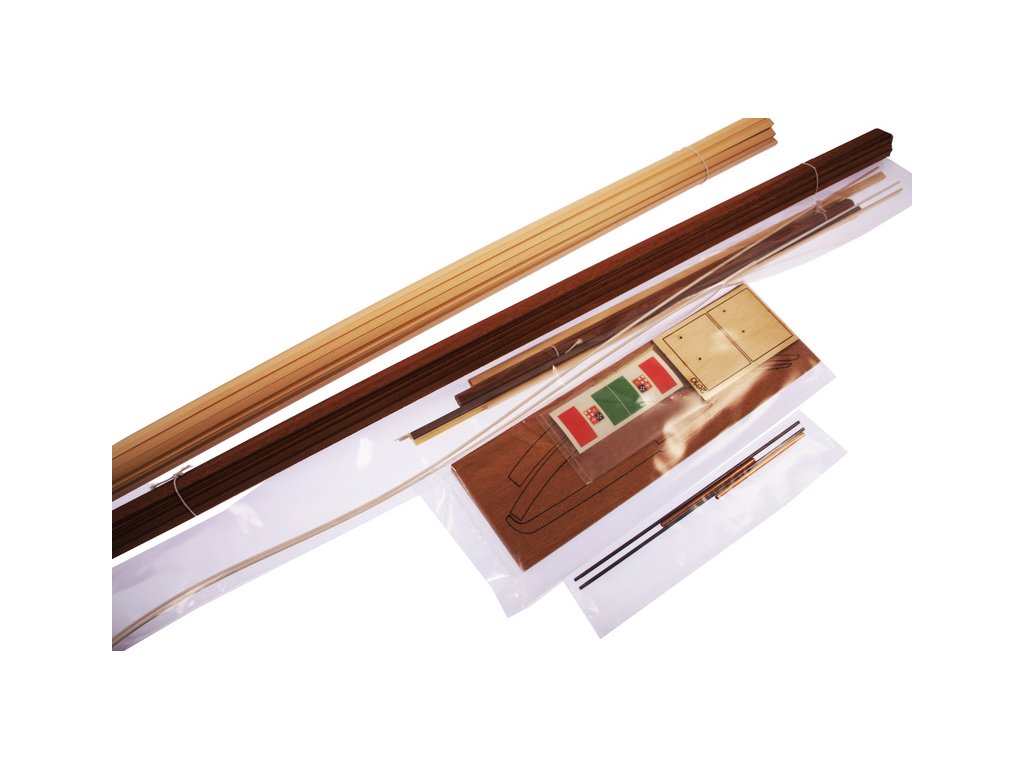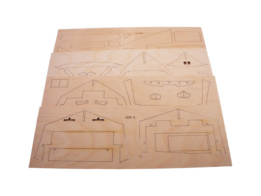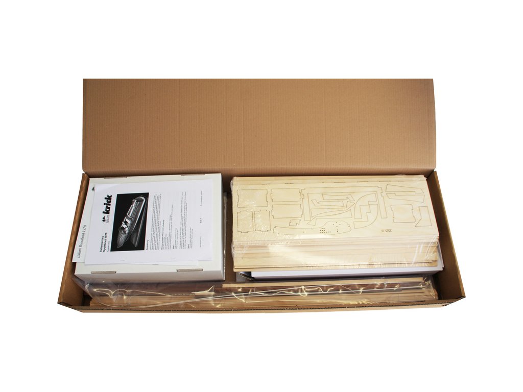 Balení obsahuje sadu překližkových dílů, sadu dřevěných lišt o různém průřezu, blistr s drobnými díly, sadu výkresů a vícejazyčný manuál.