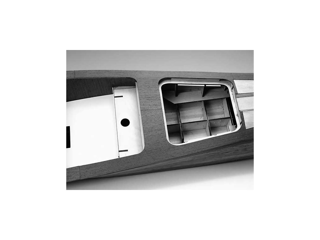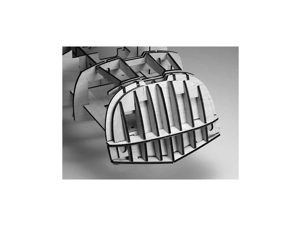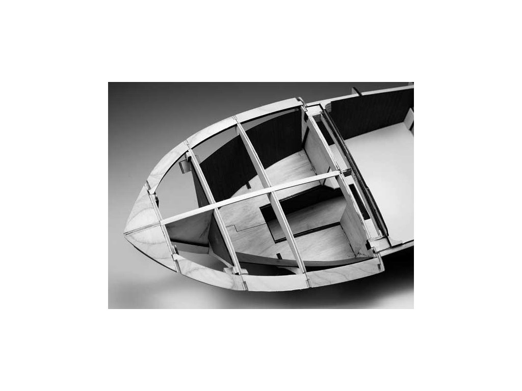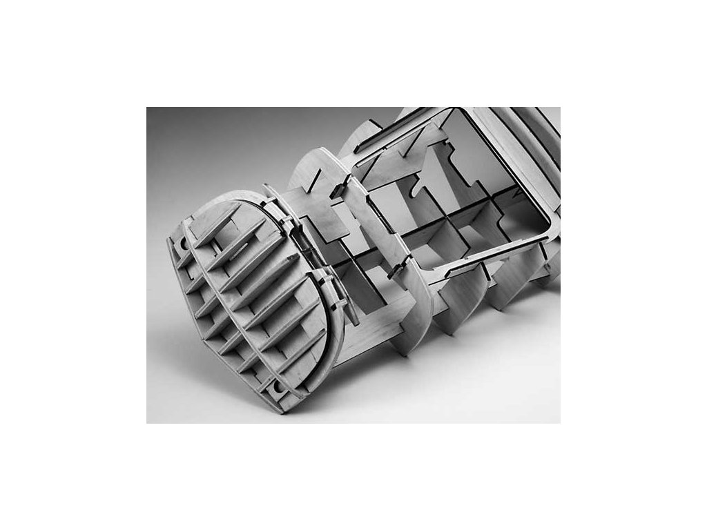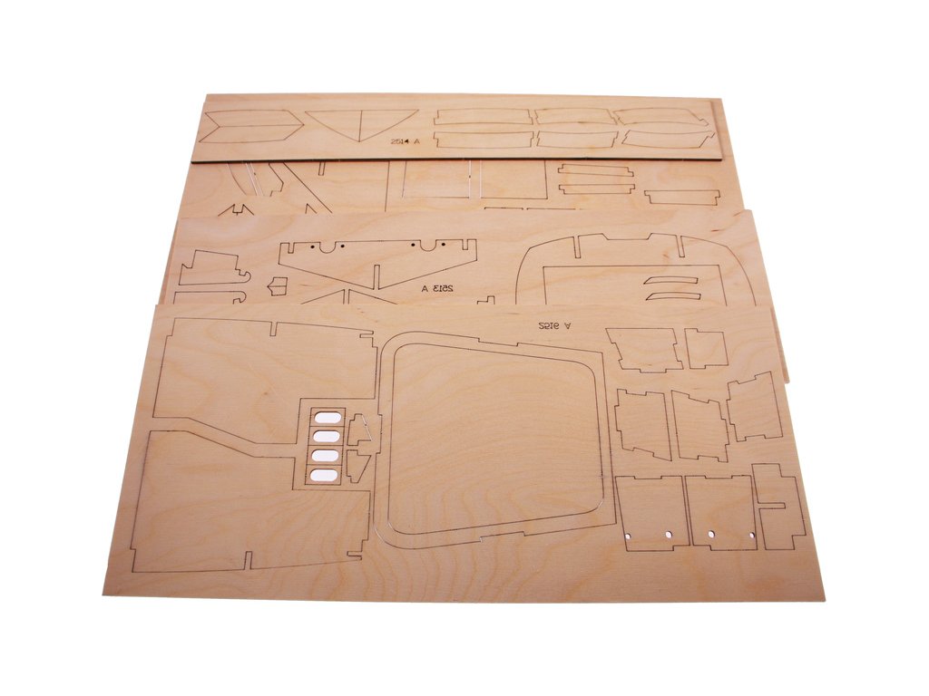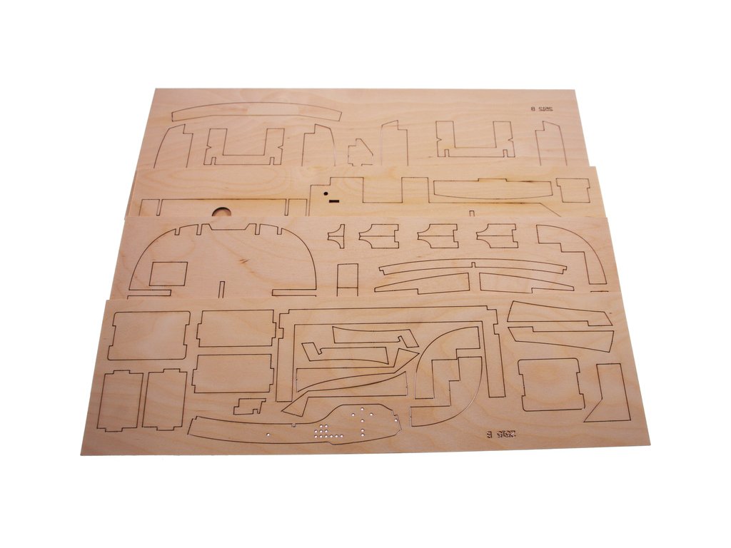 Po otevření víka krabice naleznete dřevěné díly modelu z překližky, sadu lišt, drobné součásti uzavřené v plastovém průhledném blistru, sadu výkresů a manuál.