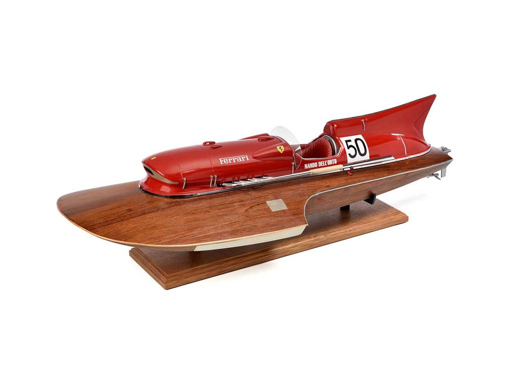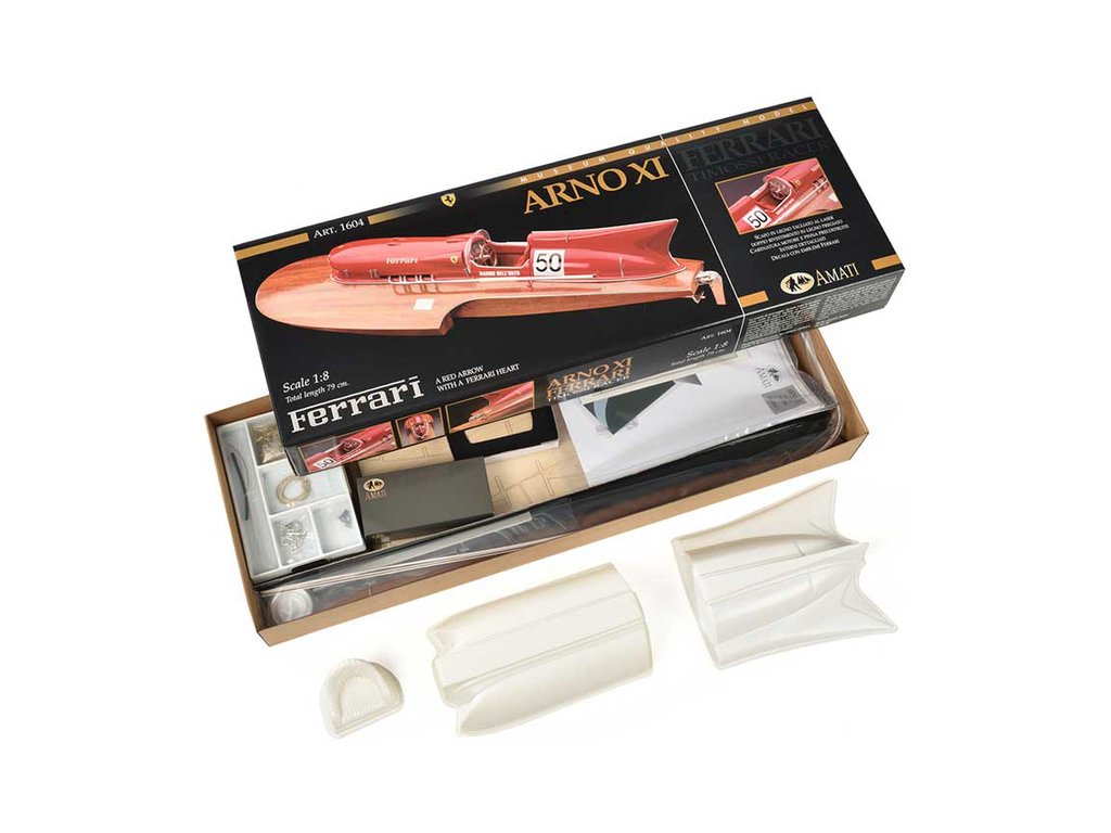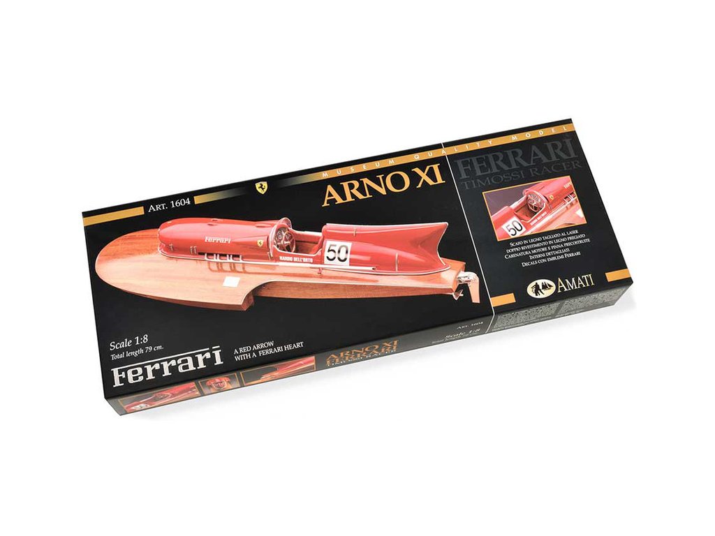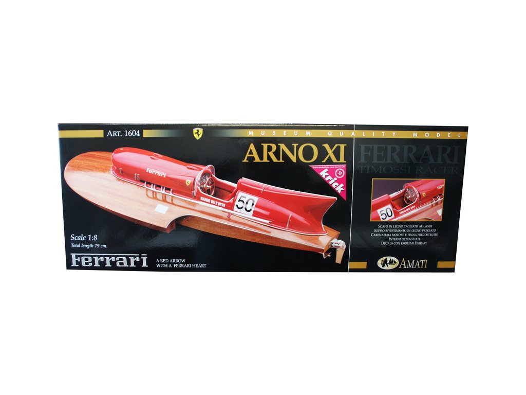 Stavebnice AMATI Arno XI Ferrari závodní člun 1:8 kit obsahuje všechny dřevěné díly, které jsou vyřezány laserem z překližky a mahagonu. Kryt motoru, kormidlo, palubní deska a předměty jsou vyrobeny z kovu. Výfuky a volant z pryskyřice. Loď postavil Timosi a je vybavena 12-válcovým motorem od Ferrari s výkonem 550 koní. Člun Amati dosáhl světového rekordu rychlostí 241,708 km/h. Model může být vybaven elektromotorem a je schopen používat RC soupravu.