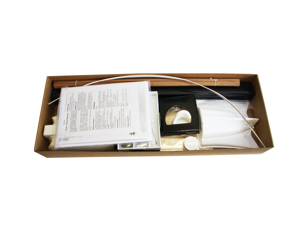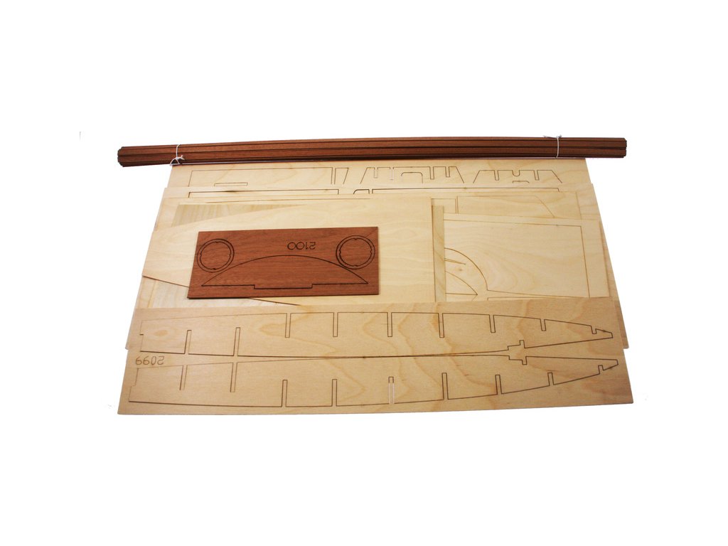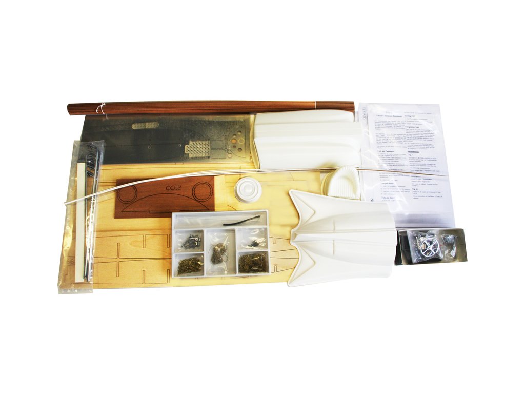 Balení obsahuje sadu překližkových dílů, sadu dřevěných lišt o různém průřezu, sáčky s drobnými díly, plastové výlisky, díly z kovu a plystu, sadu výkresů a vícejazyčný manuál.