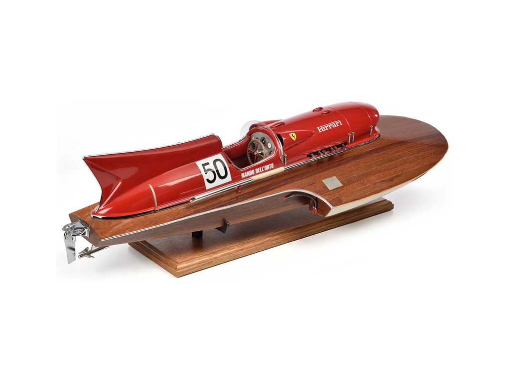 Stavebnice AMATI Arno XI Ferrari závodní člun 1:8 kit obsahuje dřevěné díly z překližky a mahagonu. Kryt motoru, kormidlo, palubní deska jsou vyrobeny z kovu, výfuky a volant z pryskyřice. Loď Amati byla vybavena 12-válcovým motorem od Ferrari s výkonem 550 koní. Dosáhl světového rekordu rychlostí 241,708 km/h.