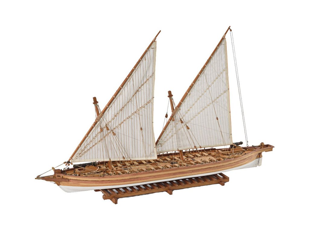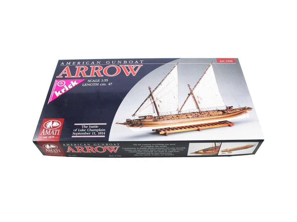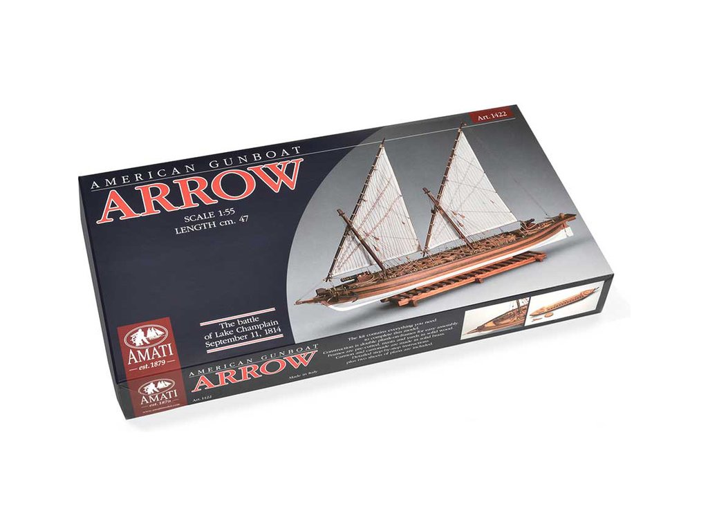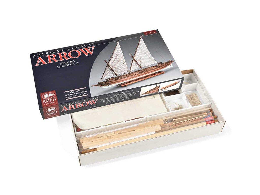 Stavebnice statické makety historické lodi AMATI Arrow bitevní loď 1814 1:55 kit. Šlo o dělový plachetní člun. Set obsahuje všechny součásti potřebné ke stavbě tohoto výjimečného modelu. Dřevěné díly jsou řezány laserem.Obsaženy jsou rovněž plachty a vlajky. Set je doplněn mnoha detailními ilustracemi.