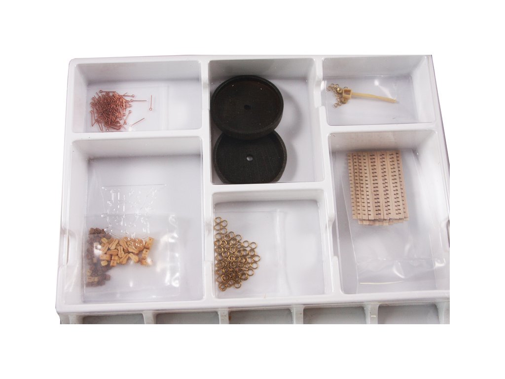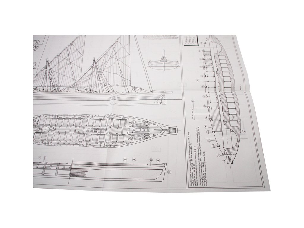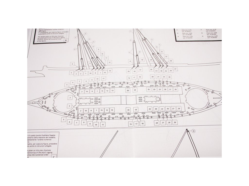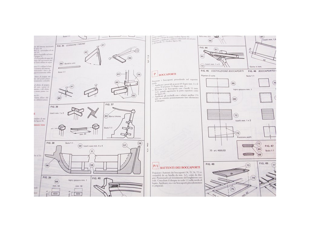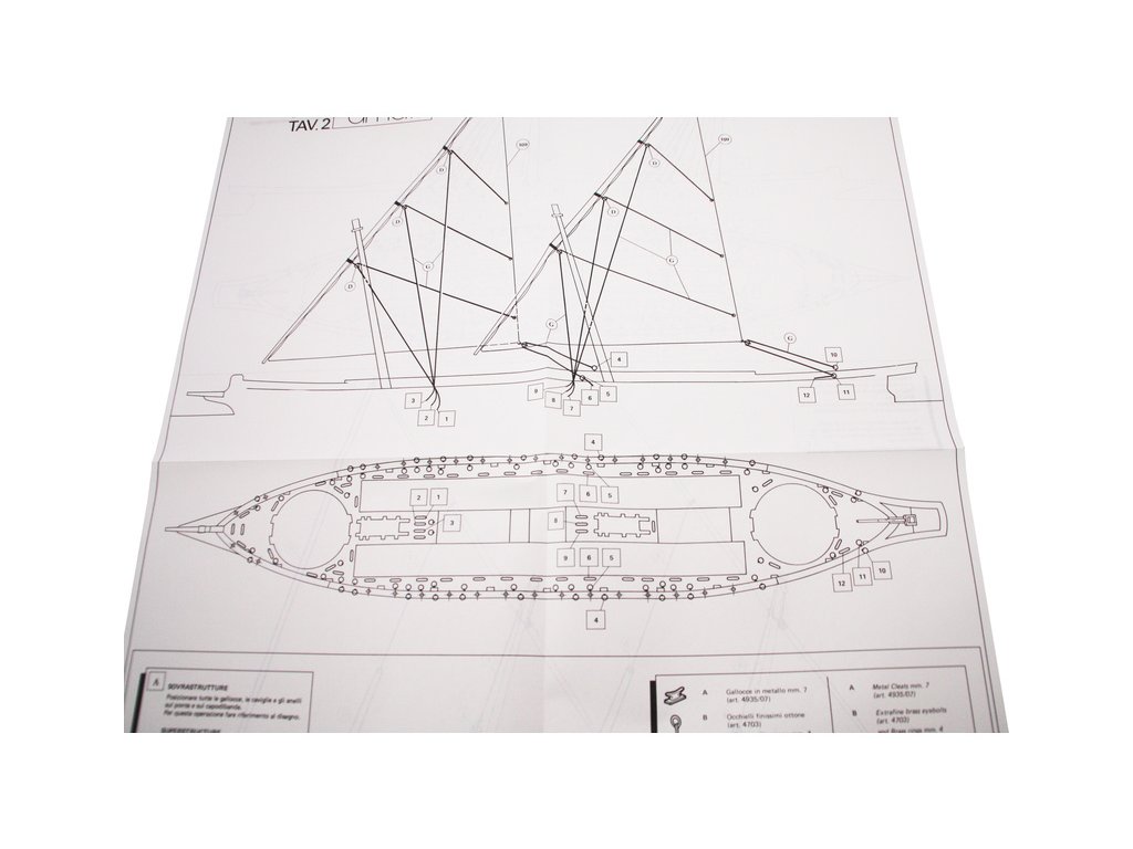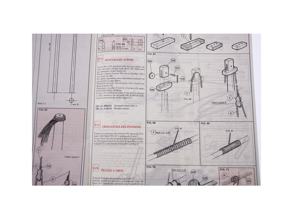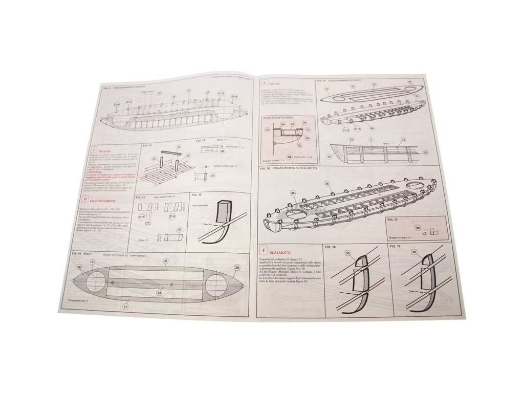 Balení obsahuje sadu překližkových dílů, sadu dřevěných lišt o různém průřezu, blistr s drobnými díly, sadu výkresů a manuál anglický, německý, francouzský a italský.