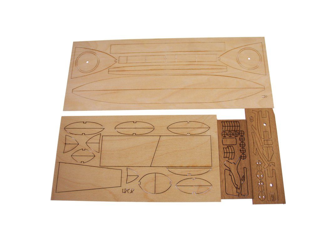 Po otevření víka krabice naleznete dřevěné díly modelu z překližky, sadu lišt, drobné součásti uzavřené v plastovém průhledném blistru, sadu výkresů a manuál.