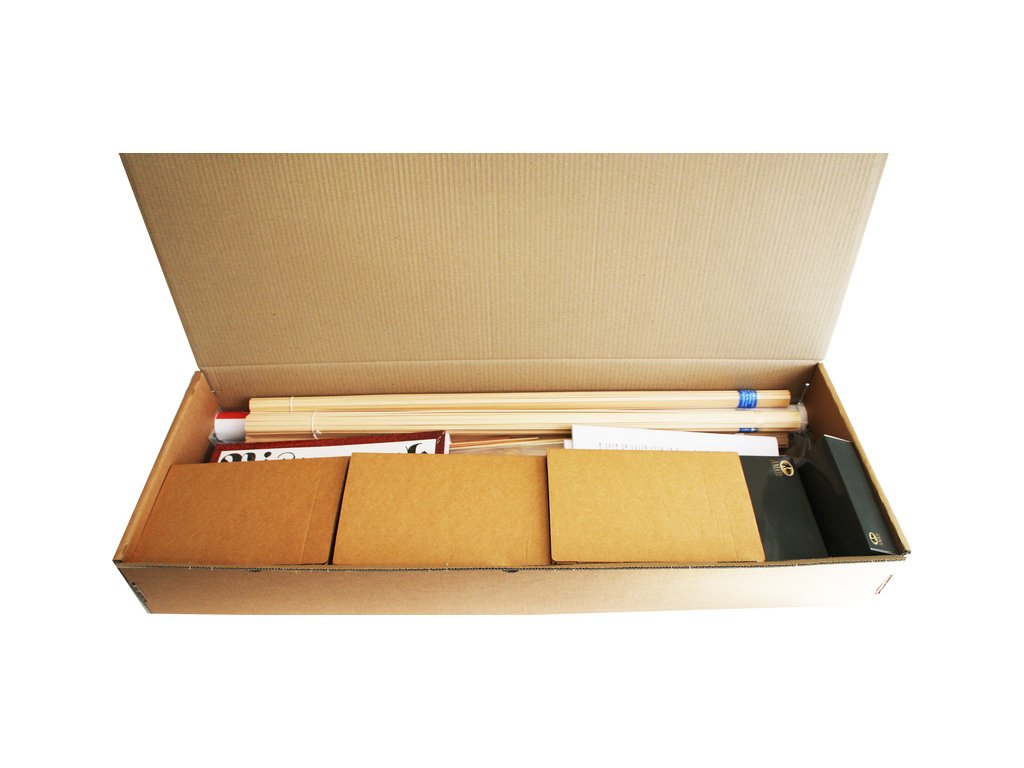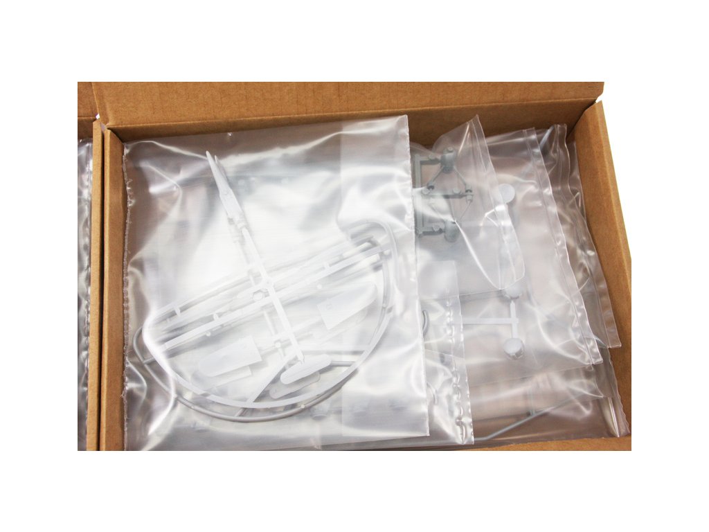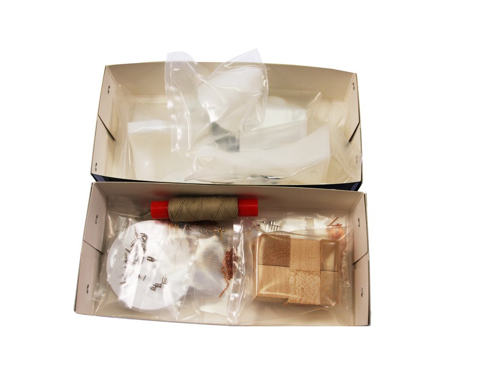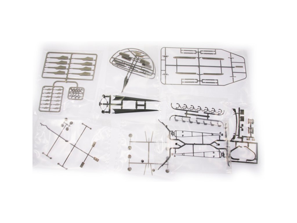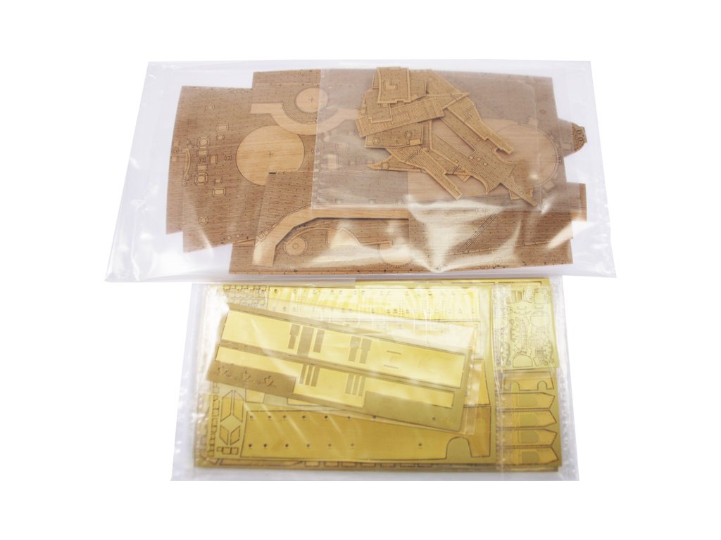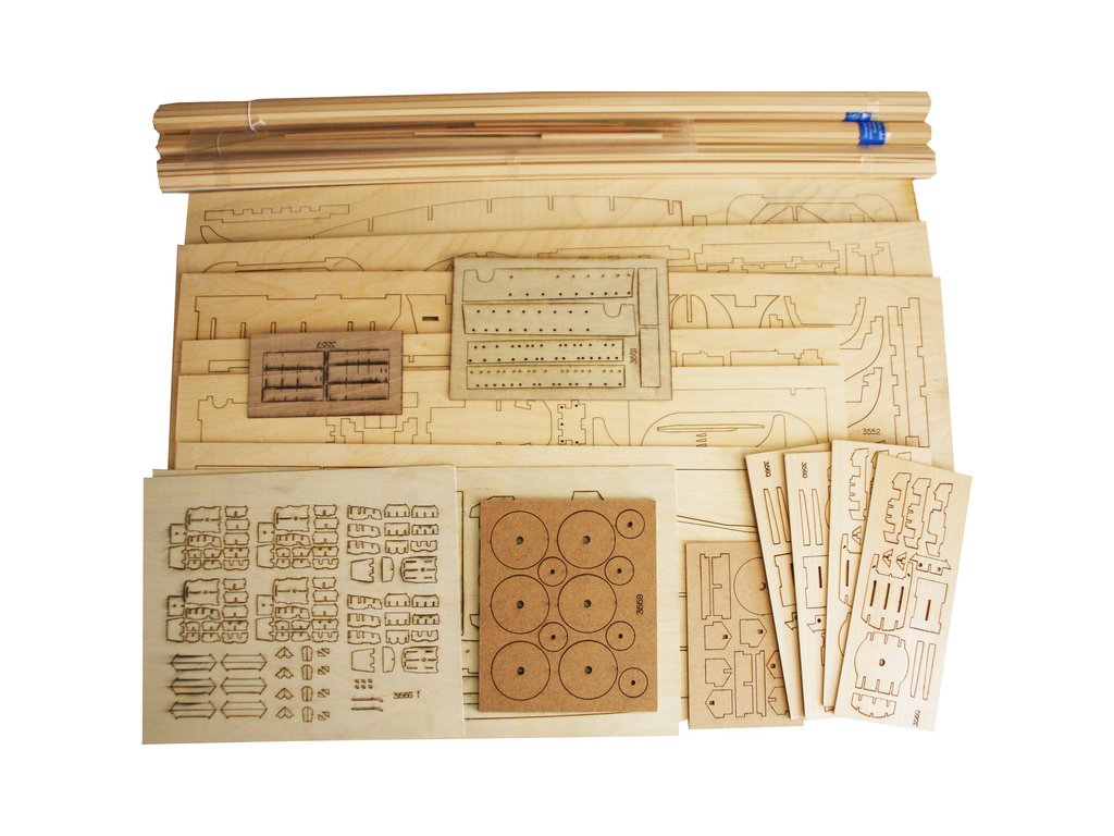 Balení obsahuje sadu překližkových dílů, sadu dřevěných lišt o různém průřezu, sáčky s drobnými díly, díly z mosazi, plastové výlisky, velkou sadu výkresů a vícejazyčný manuál.