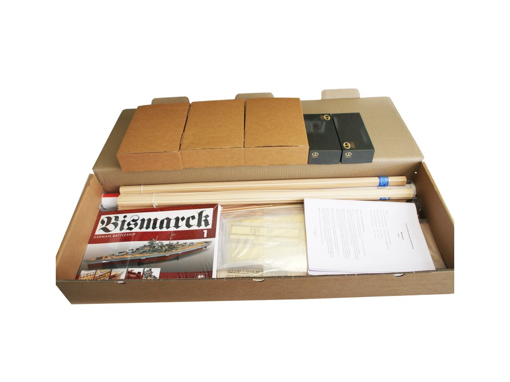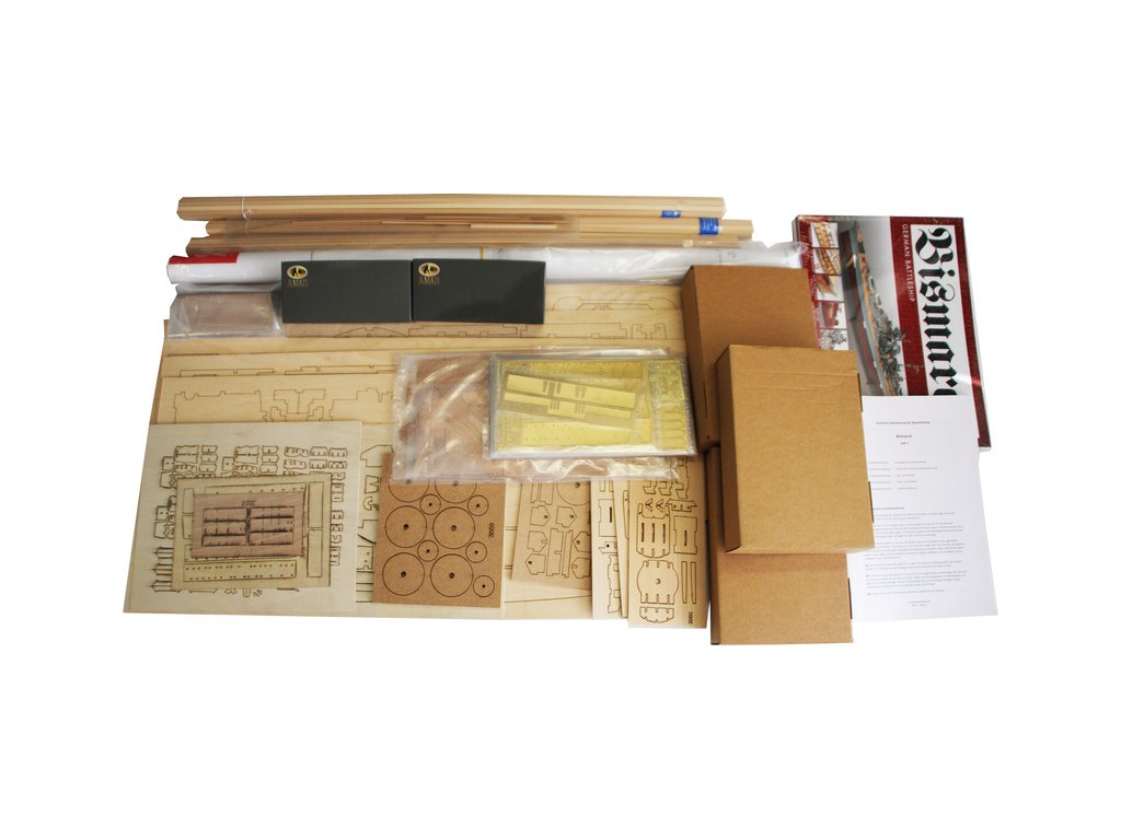 Maketa německé válečné lodi Bismark z roku 1939 v měřítku 1:200 o délce 1250mm od AMATI, je stavebnicí v rozsypu (kit) pro náročné modeláře. Bismarck je pravděpodobně nejznámější bitevní lodí německého námořnictva z období Druhé světové války. Stavebnice obsahuje laserem řezané dřevěné díly, ze kterých se vyrobí základ trup ua nástaveb. Velké množství příslušenství, 2266 leptaných dílů a mnoho odlitků.