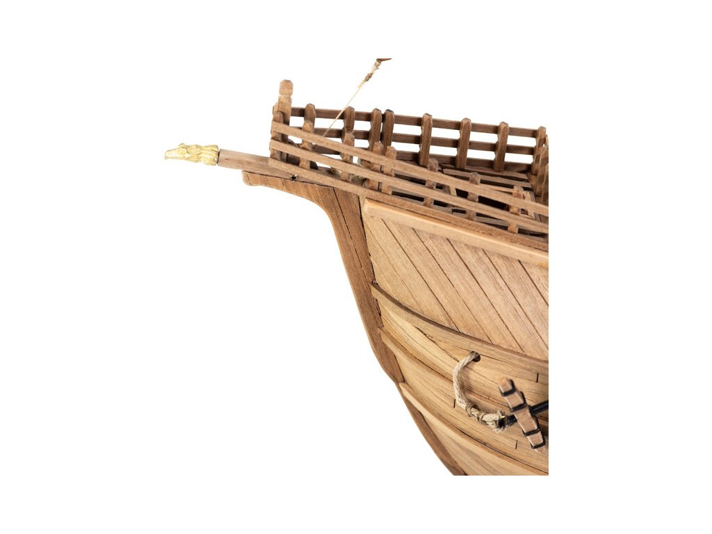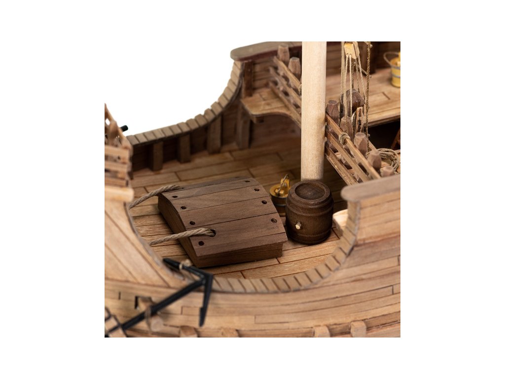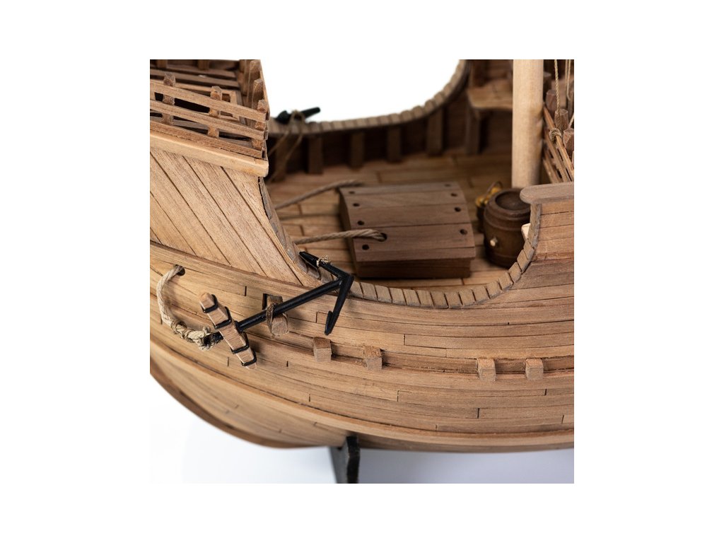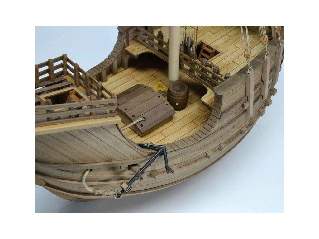 Stavebnice statické makety lodi, AMATI Coca - Karacke 15. století 1:60 kit. Byly používány v 15. století jako obchodní lodě. Typickým znakem byly dvě nástavby, ze kterých se posádky mohly bránit proti pirátským útokům. Na vrcholku stožáru byl koš. Dřevěné díly jako kýl a obšívka jsou řezány laserem, obsahuje plachty, příslušenství a plány.