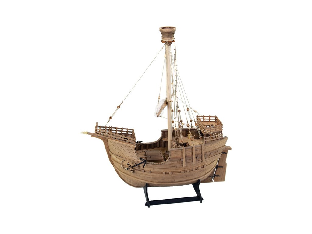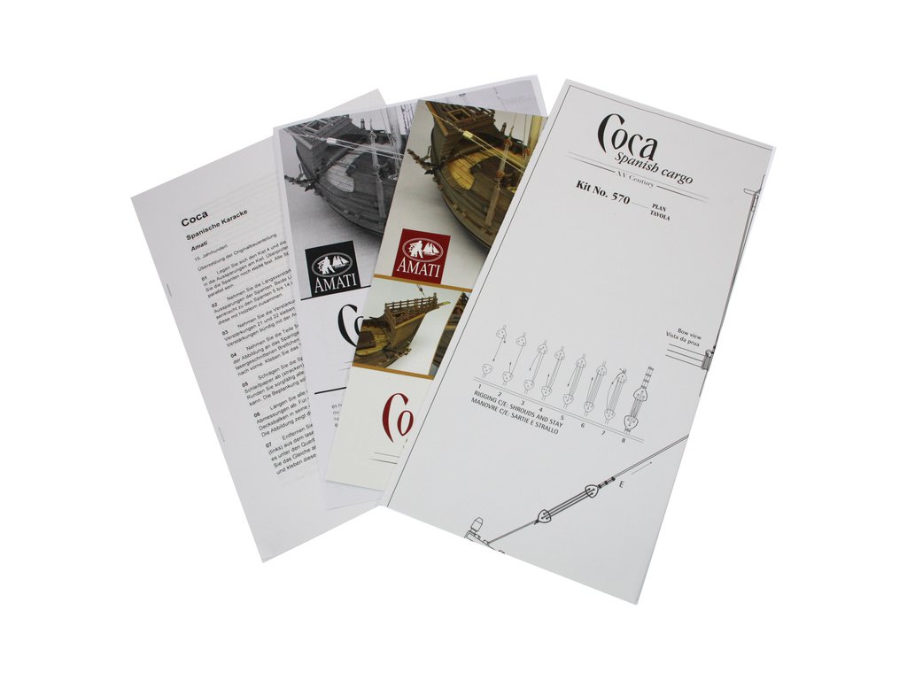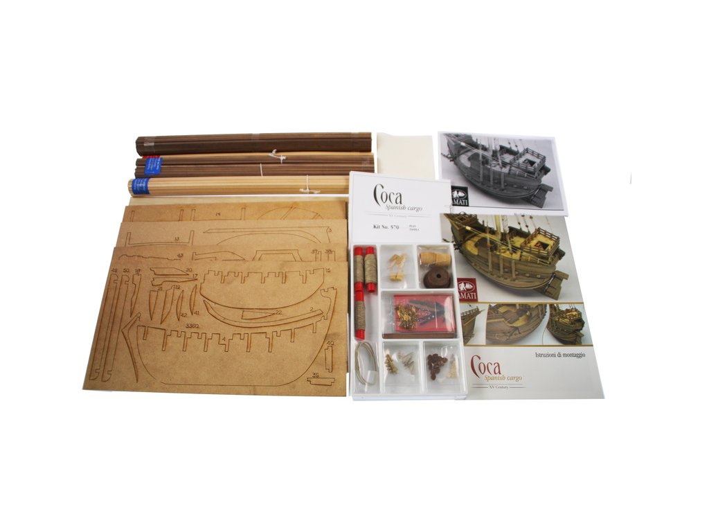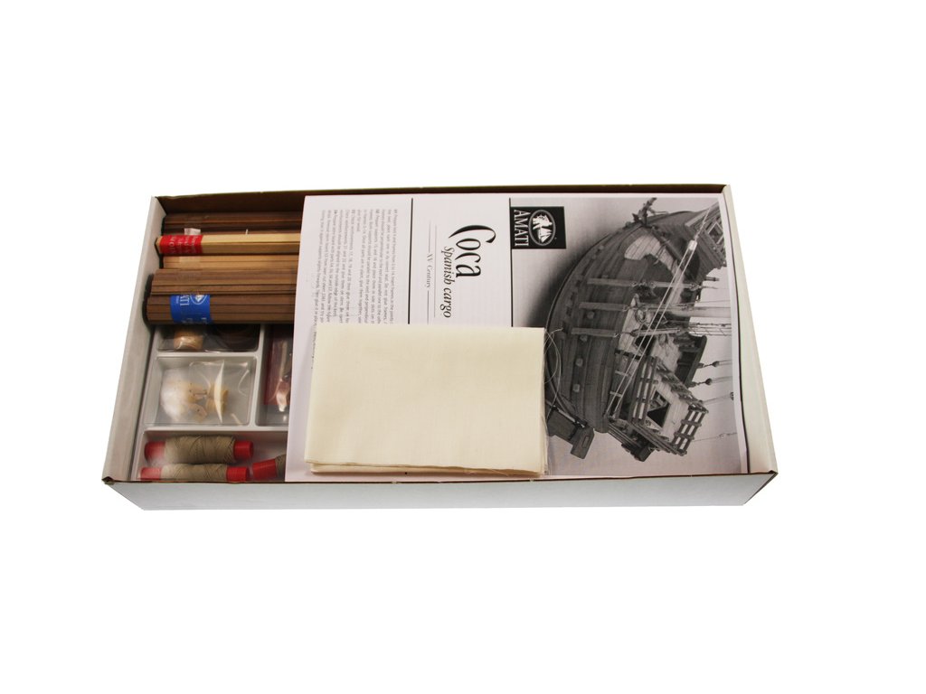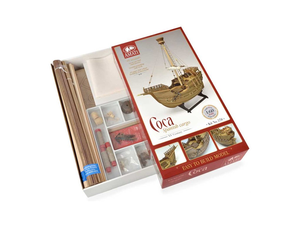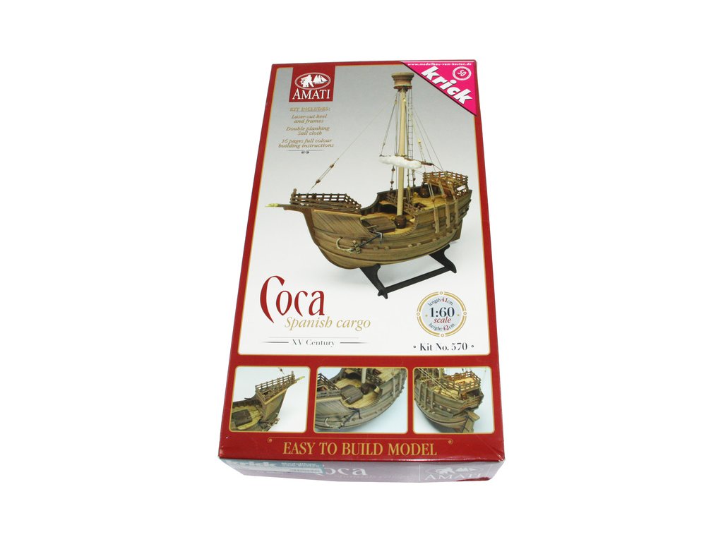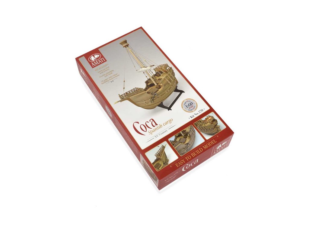 Stavebnice statické makety lodi, AMATI Coca - Karacke 15. století 1:60 kit. Byly používány v 15. století jako obchodní lodě. Typickým znakem byly dvě nástavby, ze kterých se posádky mohly bránit proti pirátským útokům. Z vyhlídky na vrcholku stožáru se pozorovalo okolního moře. Dřevěné díly jako kýl a obšívka jsou řezány laserem, obsahuje plachty, příslušenství a plány.