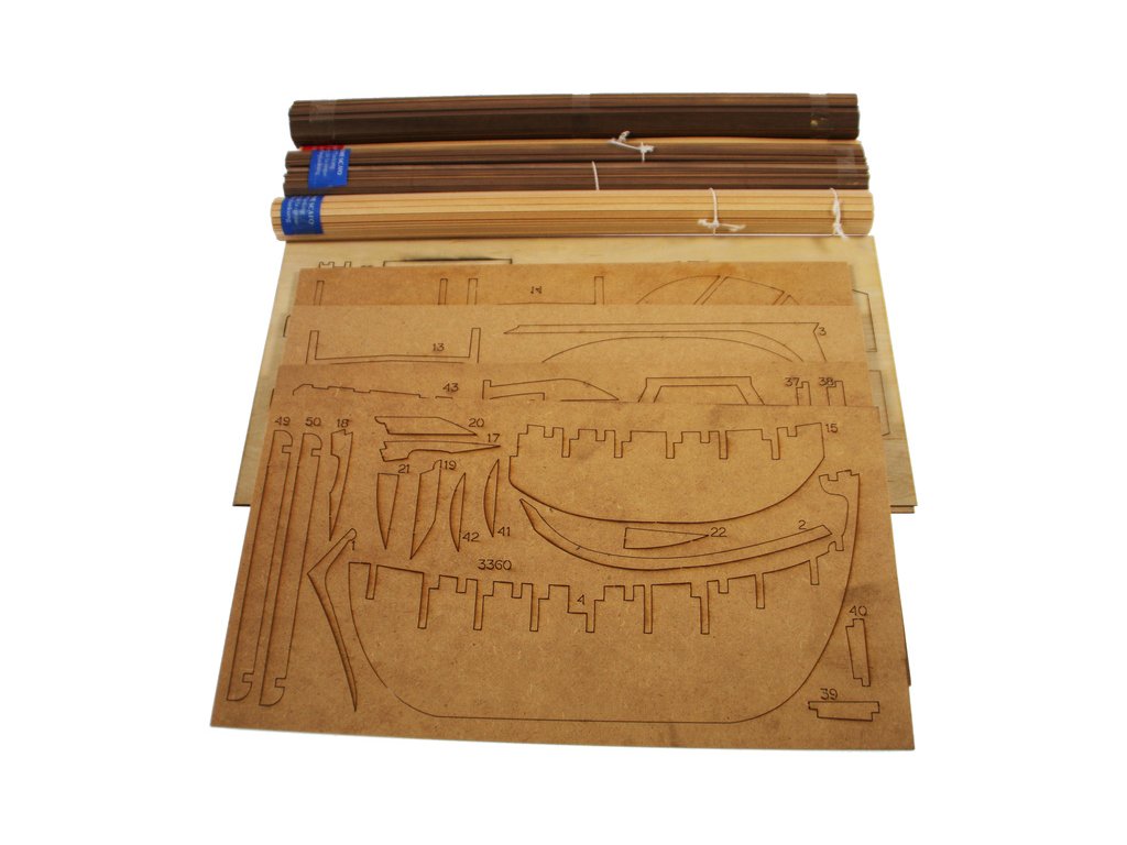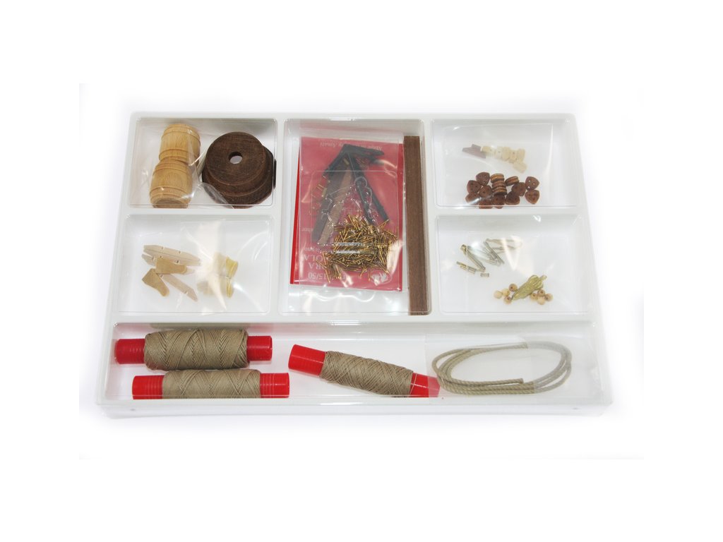 Balení obsahuje sadu překližkových dílů, sadu dřevěných lišt o různém průřezu, blistr s drobnými díly, sadu výkresů a vícejazyčný manuál.
