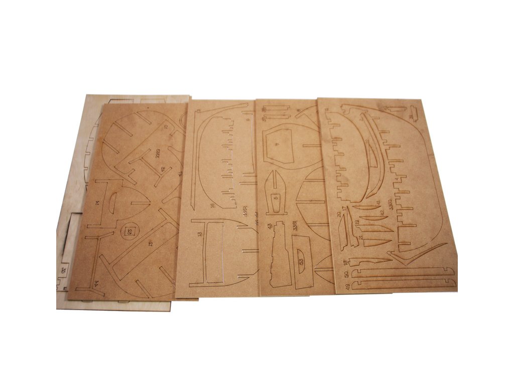 Po otevření víka krabice naleznete dřevěné díly modelu z překližky, sadu lišt, drobné součásti uzavřené v plastovém průhledném blistru, sadu výkresů a manuál.
