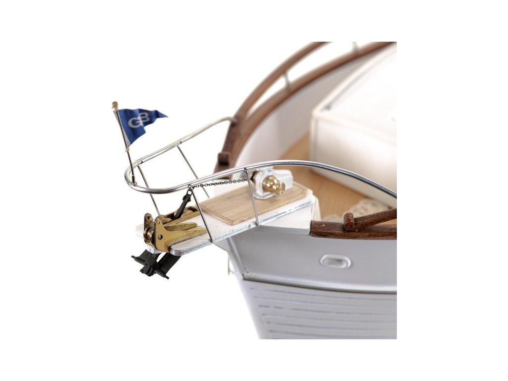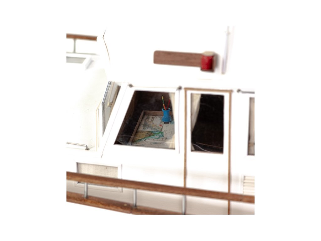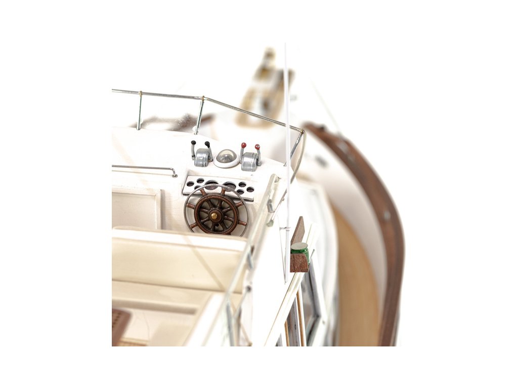 Stavebnice statické makety lodi, AMATI Grand Banks motorová jachta z roku 1967 v měřítku 1:20, kit. Přesný model klasické motorové jachty Grand Banks. V balení je trup z laminátu, laserem řezané dřevěné díly palub a nástaveb a mosazné a kovové díly. Model může být vybaven pohonem KR-25037 a dálkovým ovládáním.