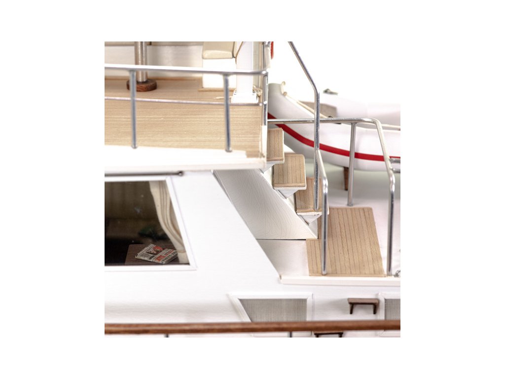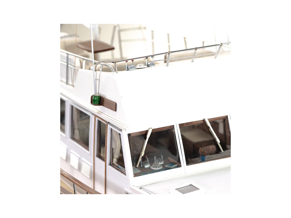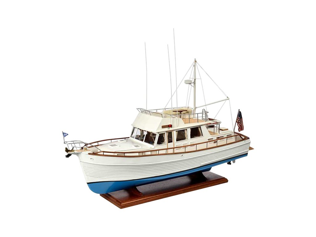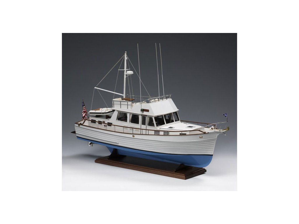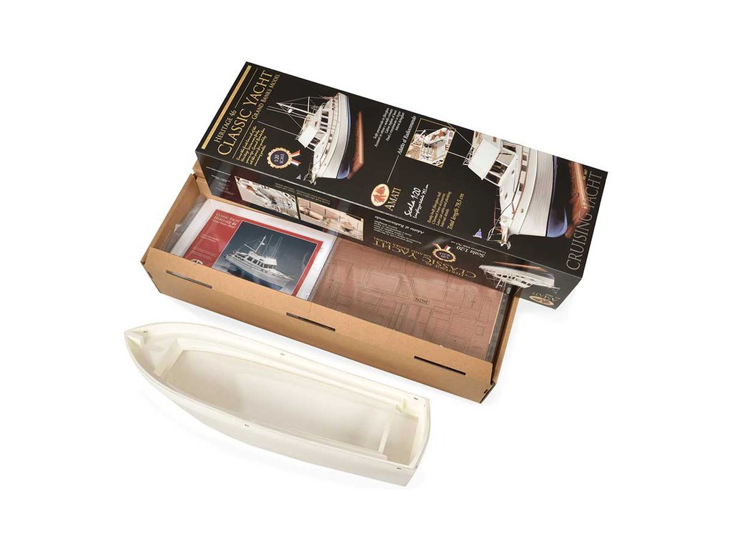 Stavebnice statické makety lodi, AMATI Grand Banks motorová jachta z roku 1967 v měřítku 1:20, kit. Přesný model klasické motorové jachty Grand Banks. V balení je trup z laminátu, laserem řezané dřevěné díly palub a nástaveb a mosazné a kovové díly. Model může být vybaven pohonem a dálkovým ovládáním.