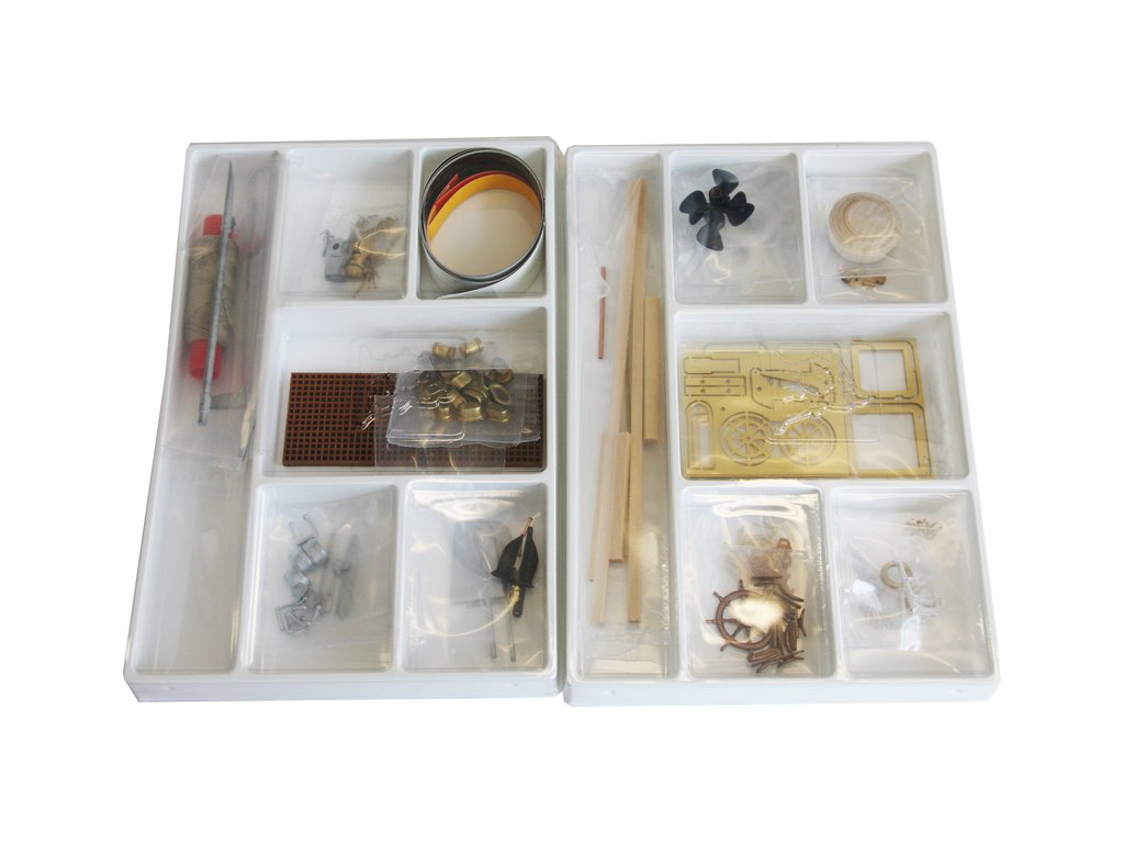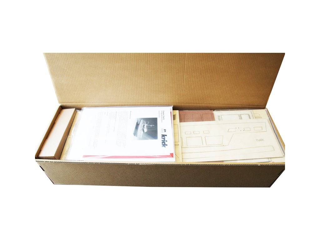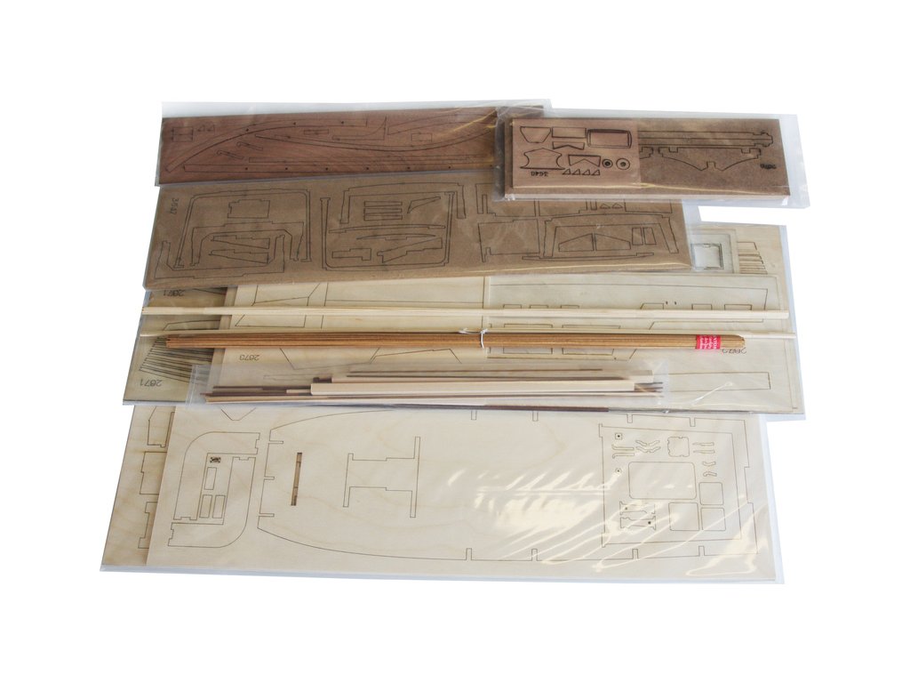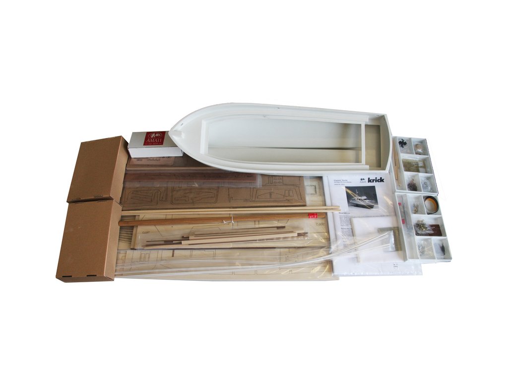 Balení obsahuje sadu desek s překližkovými díly, sadu nosníků, nabarvený laminátový trup, blistry s drobnými díly, model člunu, maketové součásti kabiny, materiál na plachty, drátěné součásti, papírové dekorace, obsáhlá sada výkresů, obrazový manuál.