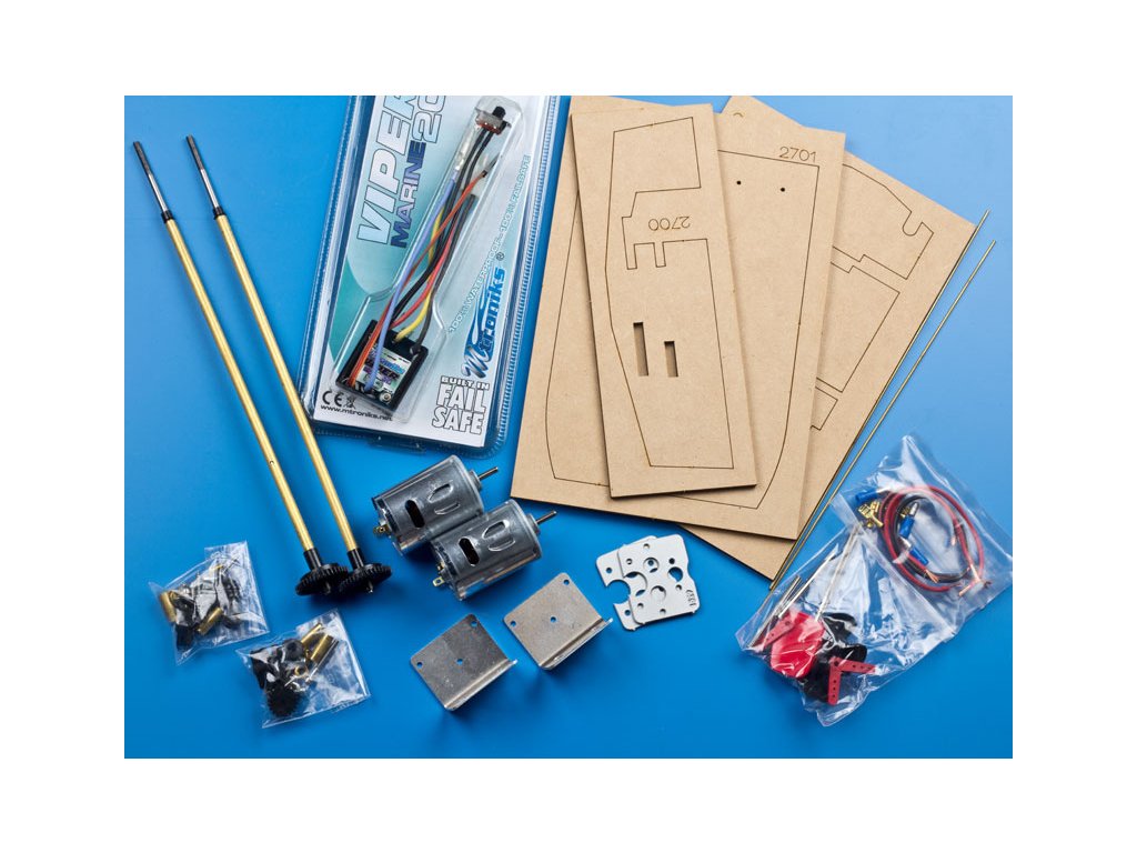 AMATI Grand Banks pohonná sada obsahuje 2 stejnosměrný motor 540, elektronický voděodolný regulátor, 2x hřídele s převodem, 2x třílisté lodní šrouby, 2x kormidlo s pákami, motorová lože, přepážky do trupu a příslušenství. Sada je určena k pohonu motorové jachty Grand Banks.