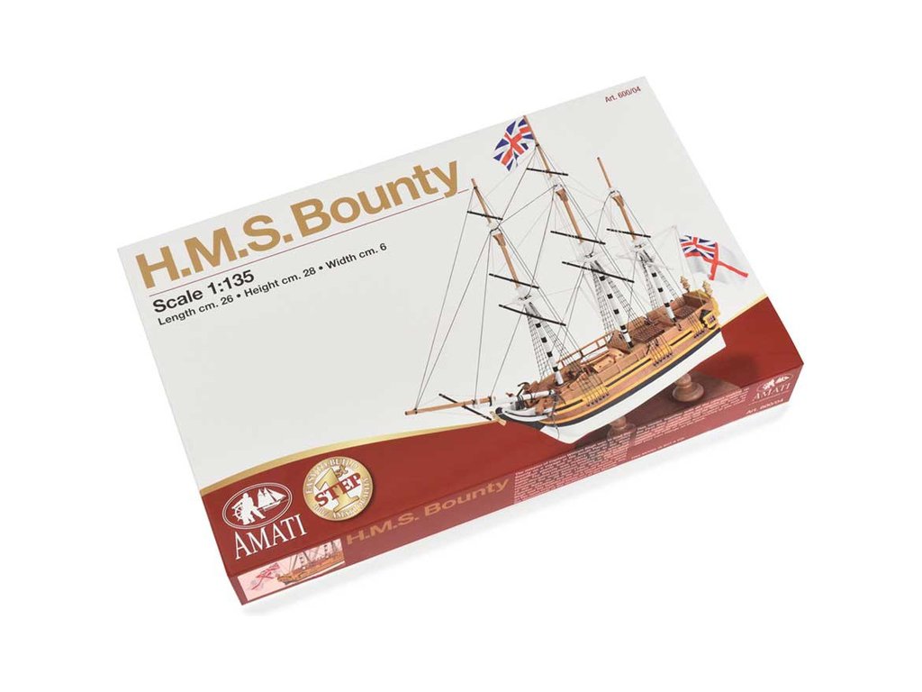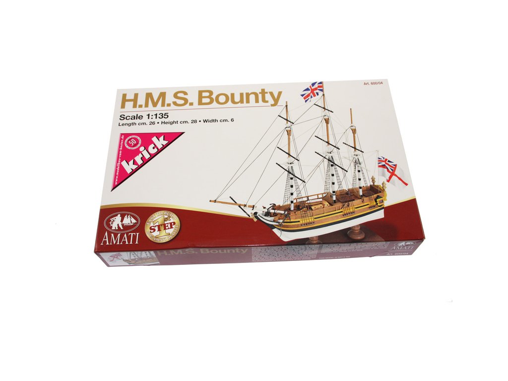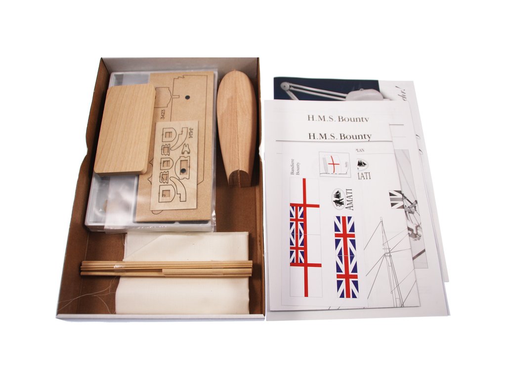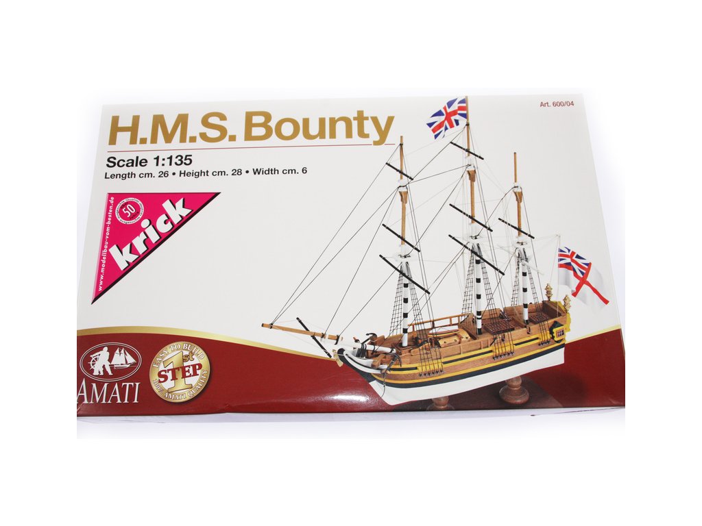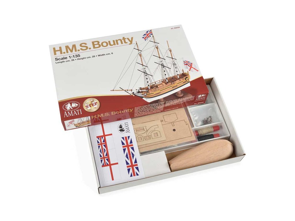 Stavebnice statické makety historické lodi, AMATI H.M.S. Bounty 1:135 First step kit. Historické lodě jsou jedněmi z nejoblíbenějších lodních modelů, proto byla vytvořena série First step kit, která je určena pro začátečníky. V setu je hotový dřevěný trup lodi, kýl s výřezy a drobné příslušenství.