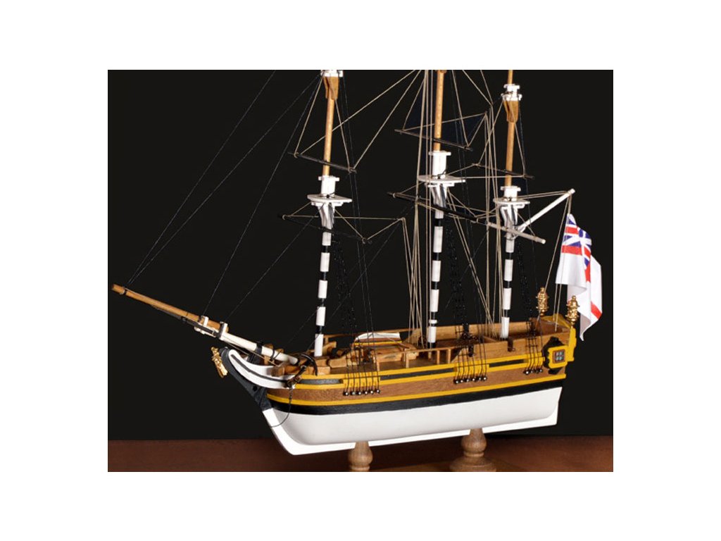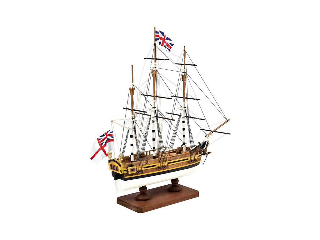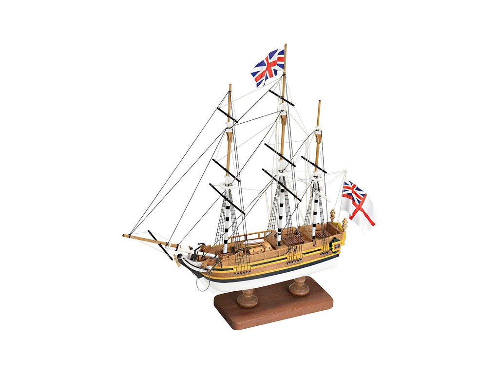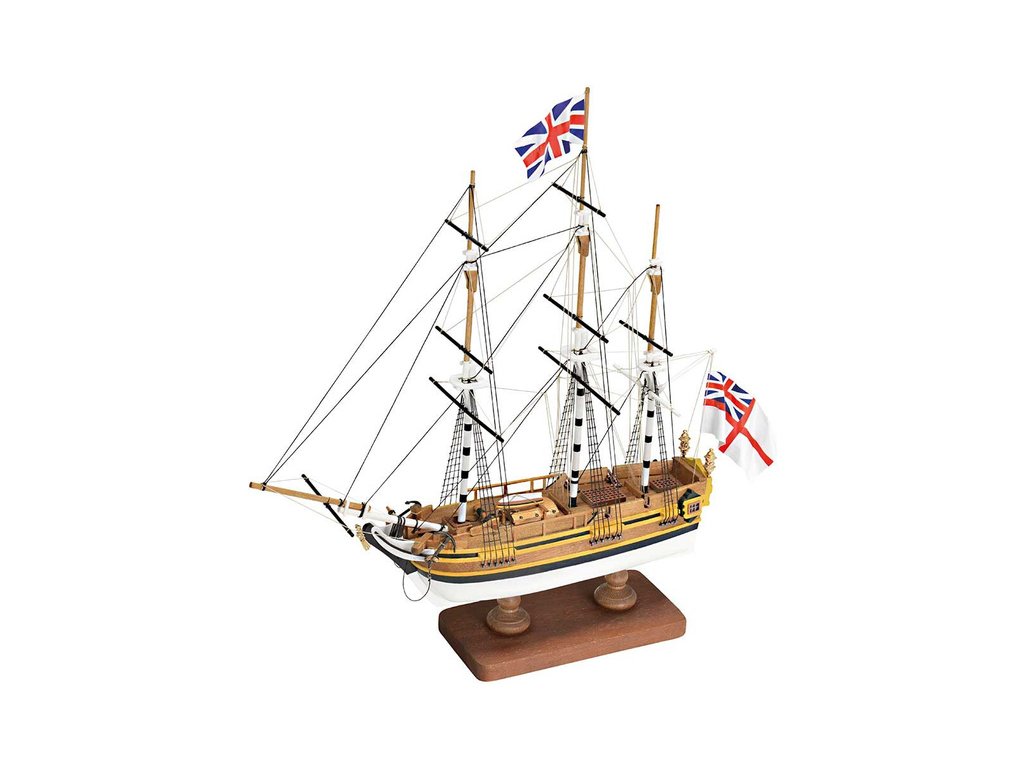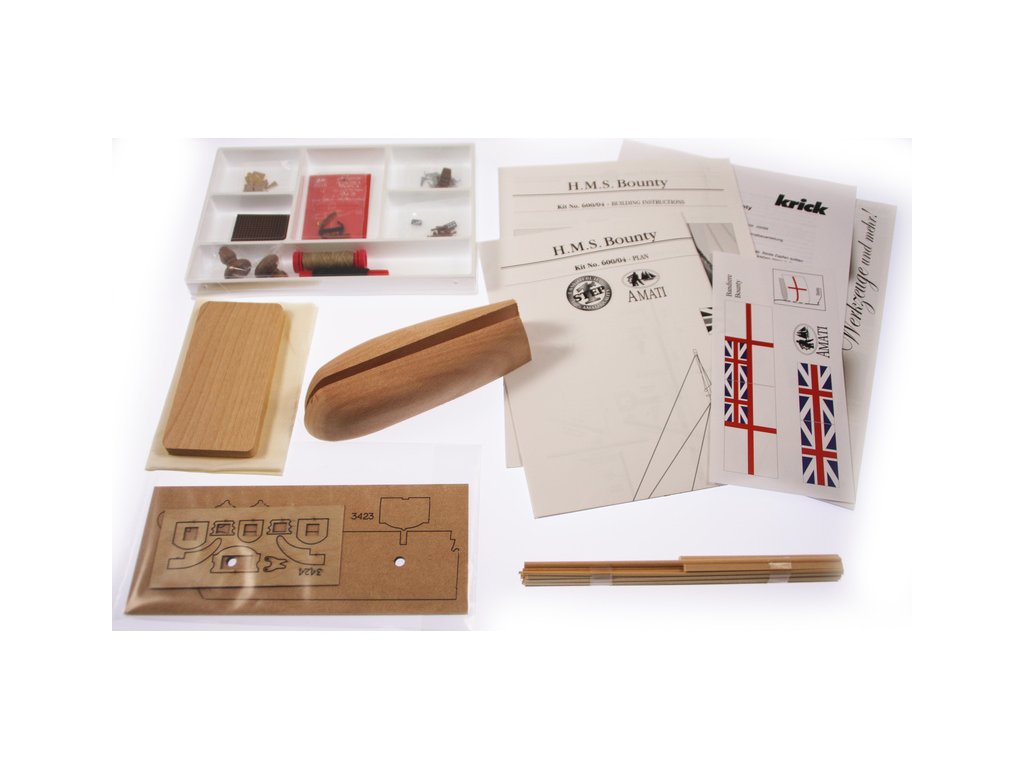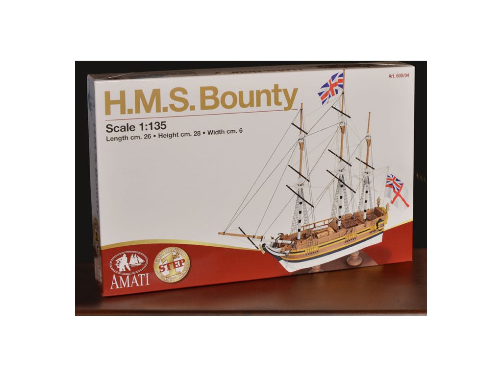 Stavebnice statické makety historické lodi, AMATI H.M.S. Bounty 1:135 First step kit. Historické lodě jsou jedněmi z nejoblíbenějších lodních modelů, proto byla vytvořena série First step kit, která je určena pro začátečníky. V setu je hotový dřevěný trup lodi, kýl s výřezy a drobné příslušenství.