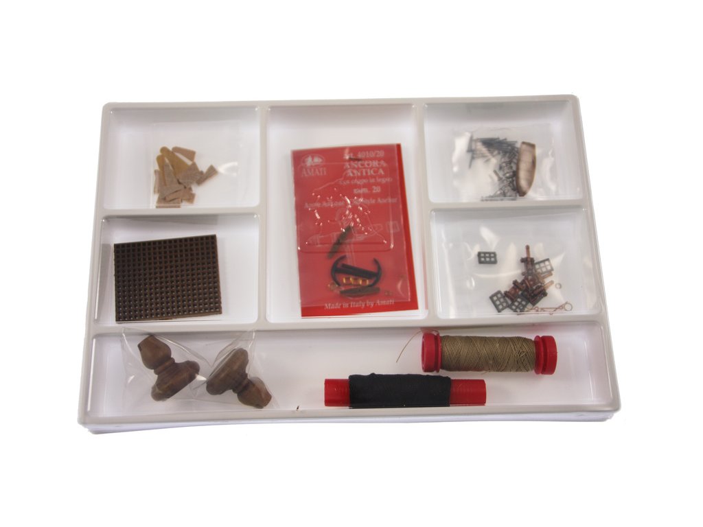 Balení obsahuje hotový polotovar trupu, překližkové díly, dřevěné lišty, blistr s drobnými díly, sadu výkresů a návod anglický a italský.