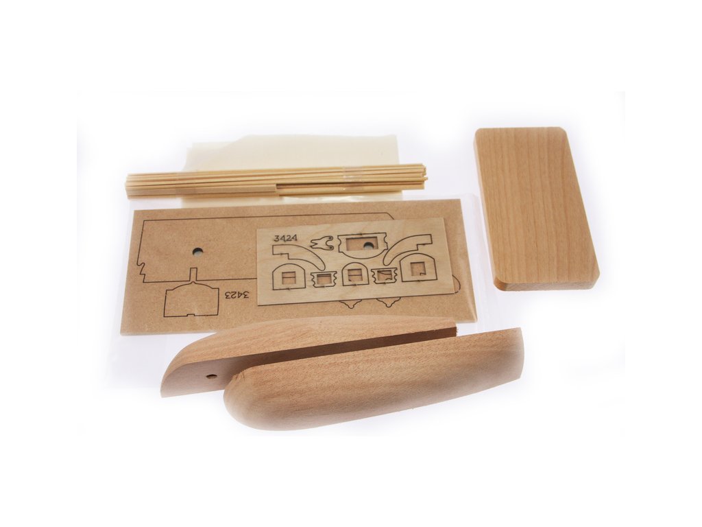 Po otevření víka krabice naleznete dřevěné díly modelu, drobné součásti uzavřené v plastovém průhledném blistru a sadu výkresů.